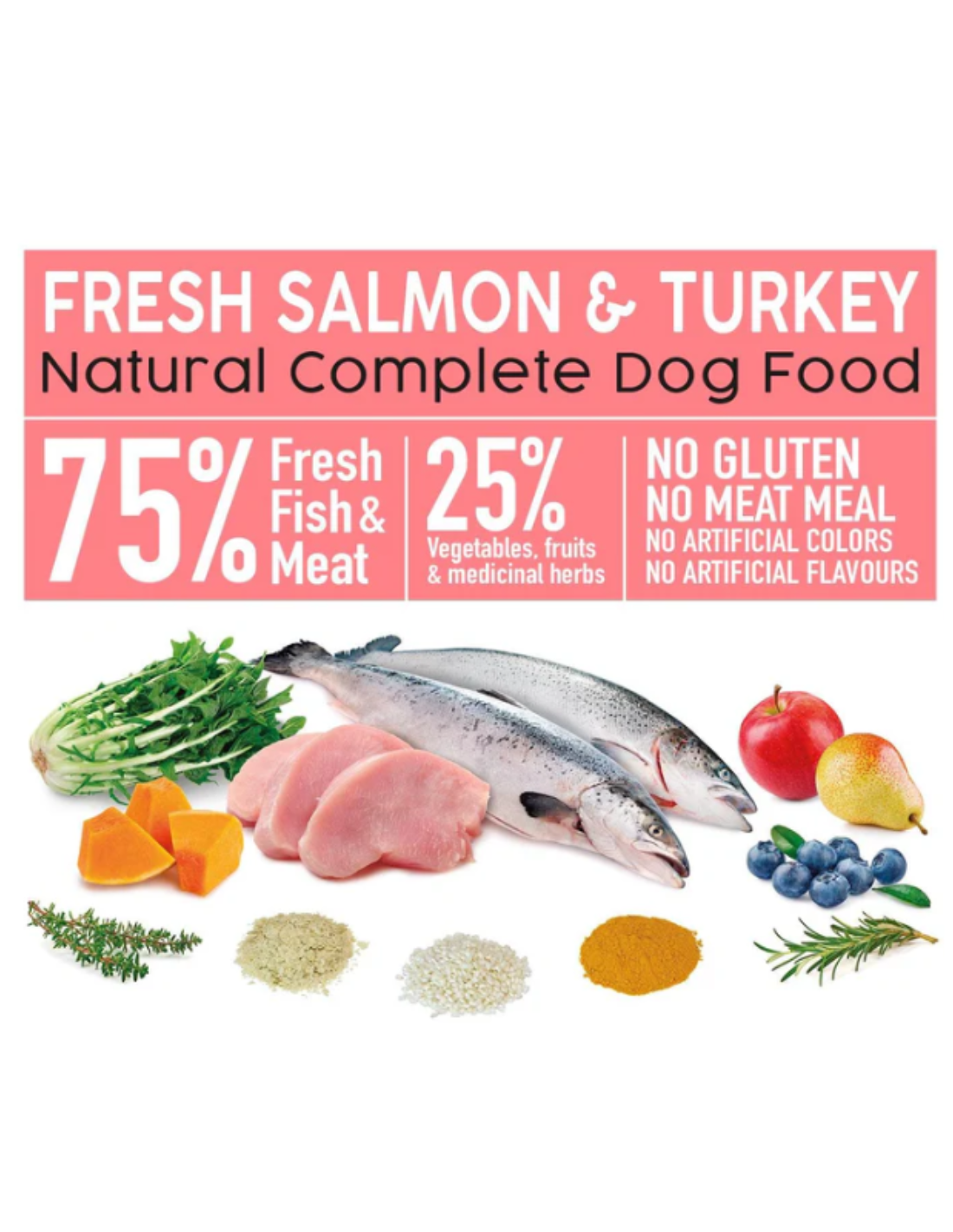 • 45 % de saumon frais + 30 % de dinde fraîche pour des protéines digestibles