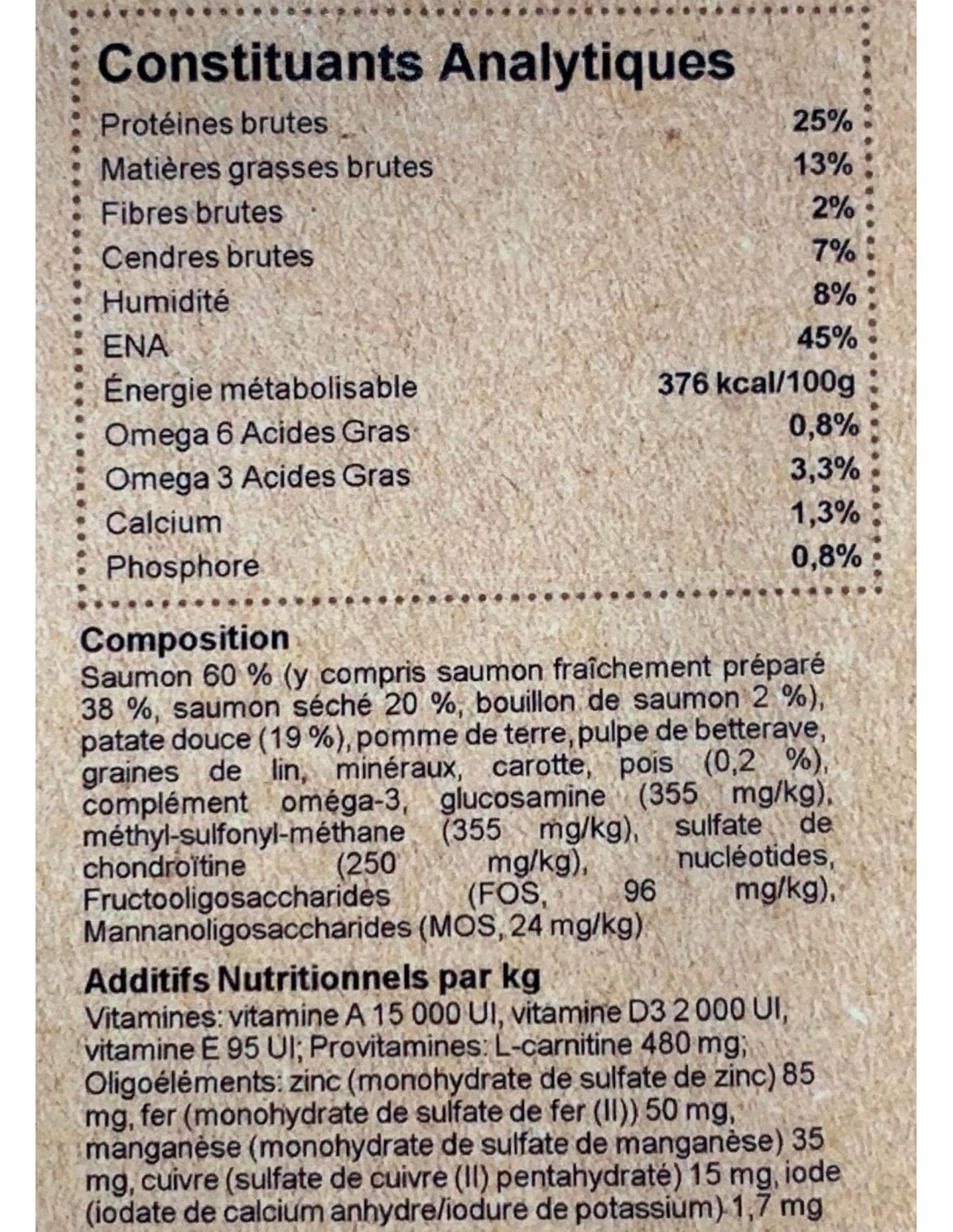 Composition: Saumon 60% (y compris du saumon fraîchement préparée 38%, saumon séché 20%, bouillon de saumon 2%), patate douce 19%, pomme de terre, pulpe de betterave, graines de lin, minéraux, vitamines, carotte, pois 0,2%, complément oméga-3, bouillon de légumes, glucosamine (355 mg/kg), méthyle-sulfonyl-méthane (355 mg/kg), sulfate de chondroïtine (250 mg/kg), nucléotides, FOS (96mg/kg), MOS (24 mg/kg)