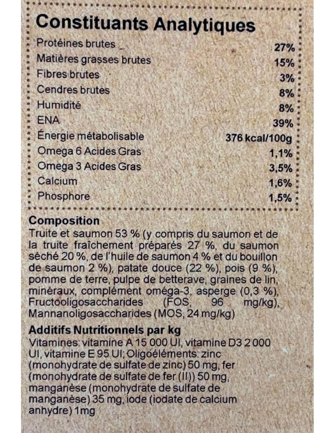 Composition: Truite et saumon 53 % (y compris du saumon et de la truite fraîchement préparés 27 %, du saumon séché 20 %, de l’huile de saumon 4% et du bouillon de saumon 2 %), patate douce (22 %), pois (9 %), pomme de terre, pulpe de betterave, graines de lin, minéraux, vitamines, compléments oméga-3, bouillon de légumes, asperges (0,3 %), FOS (96 mg/kg), MOS (24 mg/kg)