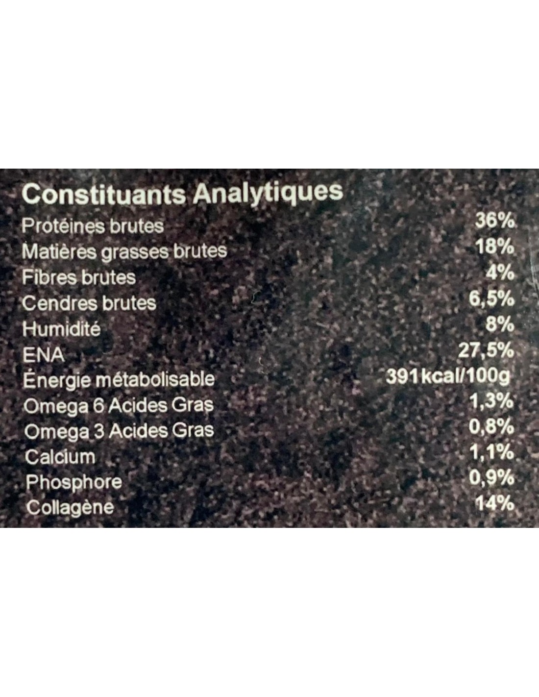 Composition: 65% de boeuf (35% de boeuf Angus fraîchement préparé, 24% de viande de boeuf séchée, 6% de graisse de boeuf), patate douce, haricots, pulpe de betterave, mélange de super aliments séchés * (dont carotte, haricots verts, chou-fleur, tomate et courgette), minéraux, oméga-3, FOs 192 mg/kg, MOS 170 mg/kg, sulfate de chondroïtine 125 mg/kg , mannanoligosaccharides 48 mg/kg, extrait d'olive 0,01%