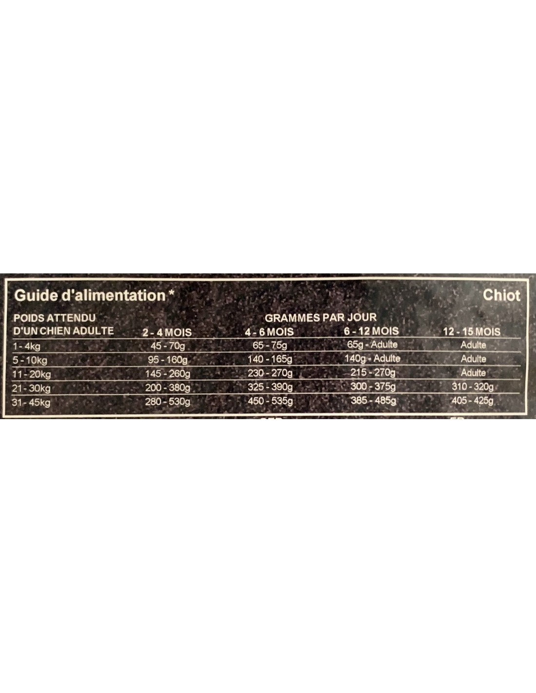 * Ce guide est à titre indicatif. Ces indications sont à adapter selon la race, l'âge, le tempérament et le niveau d'activité de votre animal. Pour une transition alimentaire adaptée et douce, veuillez introduire nouvel aliment graduellement sur une période de deux à quatre semaines. Veillez à toujours laisser de l'eau fraiche à disposition.