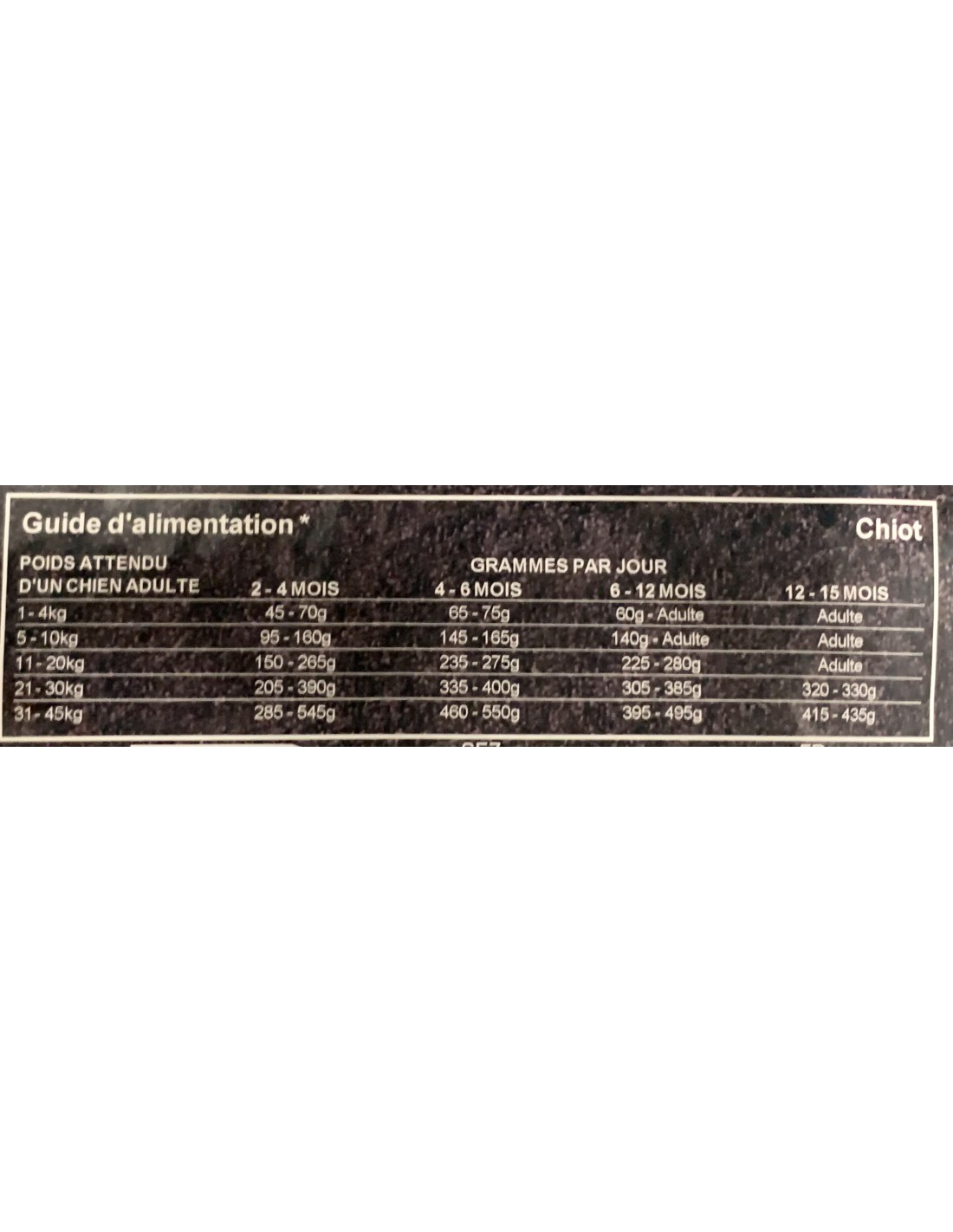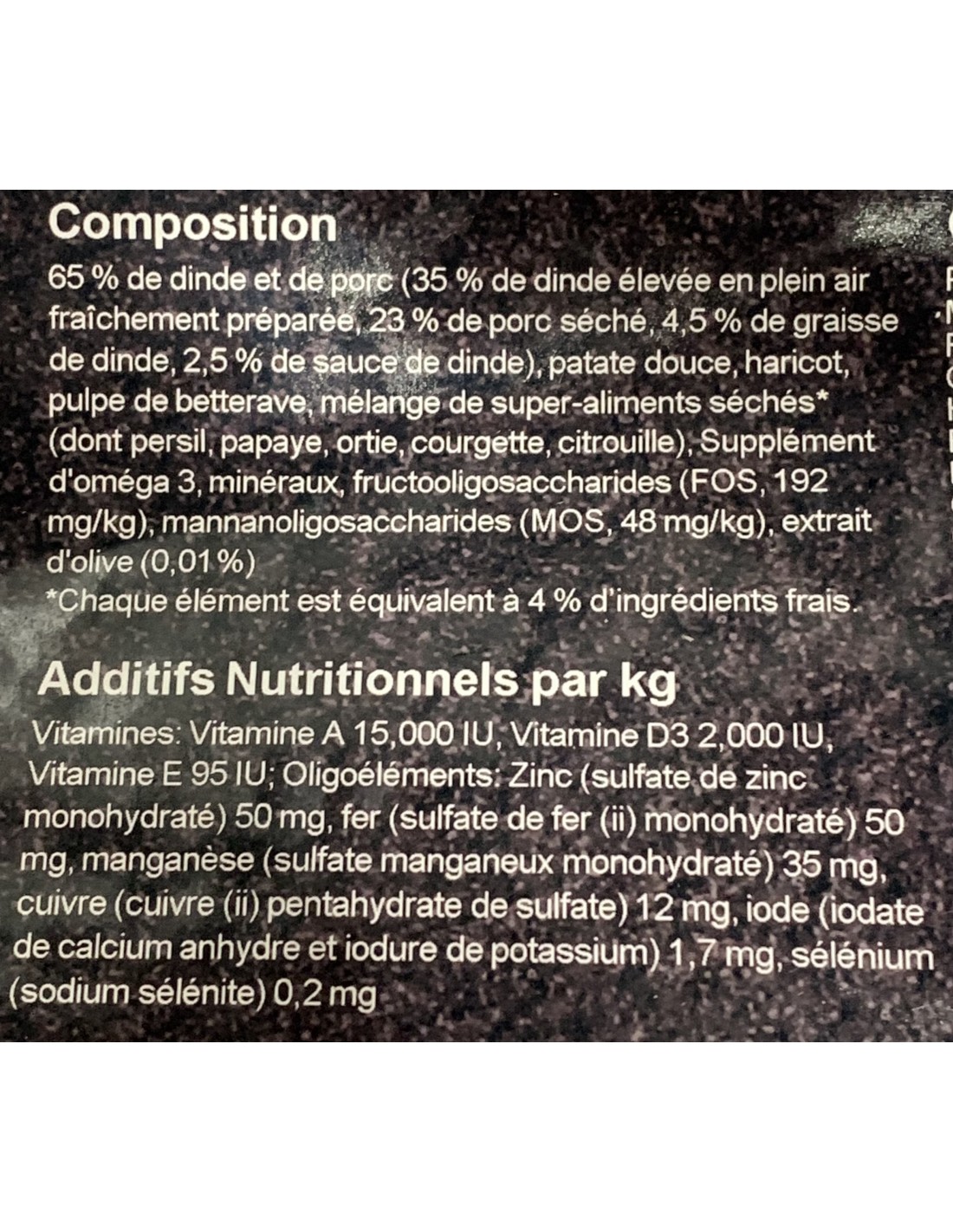 Composition : 65 % de dinde et de porc (35 % de dinde élevée en plein air fraîchement préparée, 23 % de porc séché, 4,5 % de graisse de dinde, 2,5 % de sauce de dinde), patate douce, haricot, pulpe de betterave, mélange de super-aliments séchés* (dont persil, papaye, ortie, courgette, citrouille), Supplément d'oméga 3, minéraux, fructooligosaccharides (FOS, 192 mg/kg), mannanoligosaccharides (MOS, 48 mg/kg), extrait d'olive (0,01 %) *Chaque élément est équivalent à 4 % d’ingrédients frais