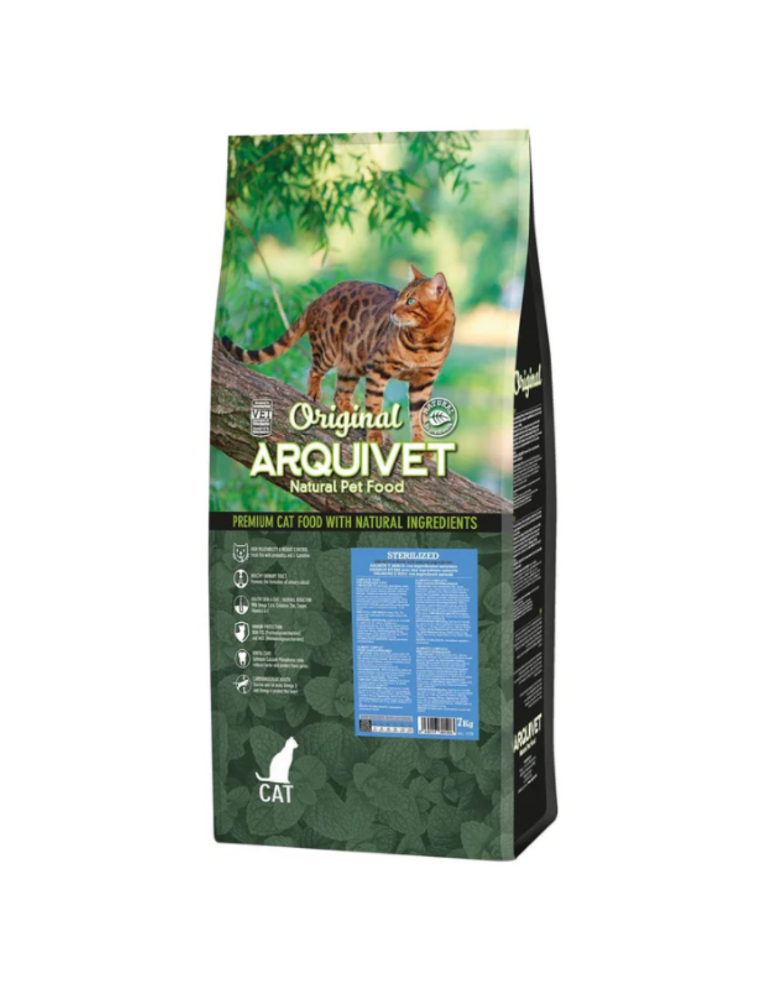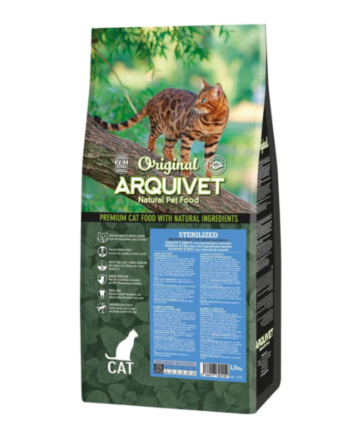 Aliment sec premium ArquiVet pour chats adultes stérilisés ou à tendance à l’embonpoint 🐱. Formule riche en protéines (35 %) et fibres (5 %), favorisant digestion saine, pelage brillant et maintien du poids. Très appétente et sans conservateurs artificiels. Disponible en 1,5 kg et 7 kg.