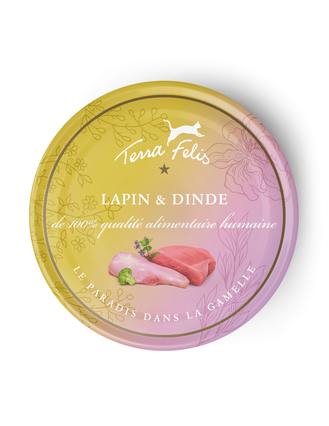 Composition: Viande de lapin (53 %), foie de dinde (21 %), viande musculaire de dinde (8 %), peau de dinde (8 %), brocoli (4 %), tomate en poudre, huile de colza, herbe-aux-chats*, minéraux *Sèches