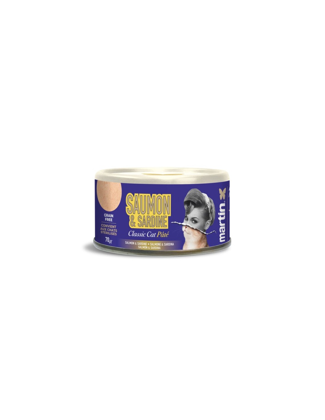 La pâtée Classic Cat Saumon Sardine de Martin Sellier est un aliment complet sans céréales pour tous les chats. Sa recette riche en poissons savoureux apporte des protéines de qualité, favorise l’hydratation et contribue au bien-être quotidien de votre chat.