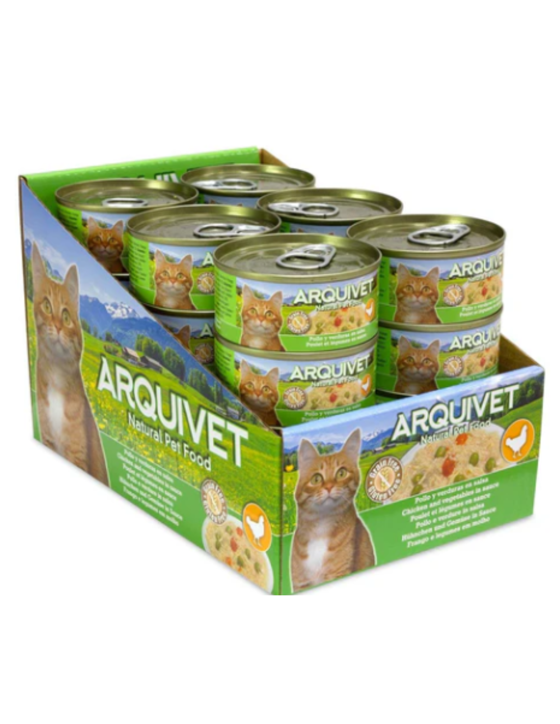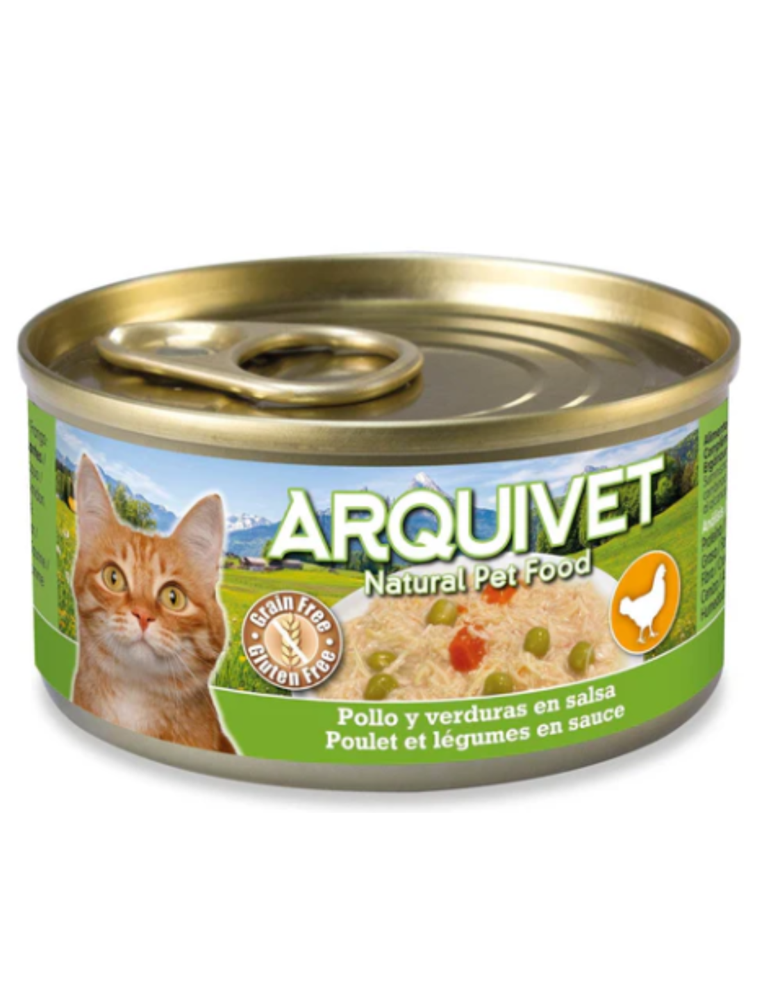 Mini filets en sauce pour chats au poulet et légumes (carottes et petits pois), en boîte de 80 g. Aliment complémentaire savoureux et riche en eau, idéal pour hydrater et varier l’alimentation quotidienne.
