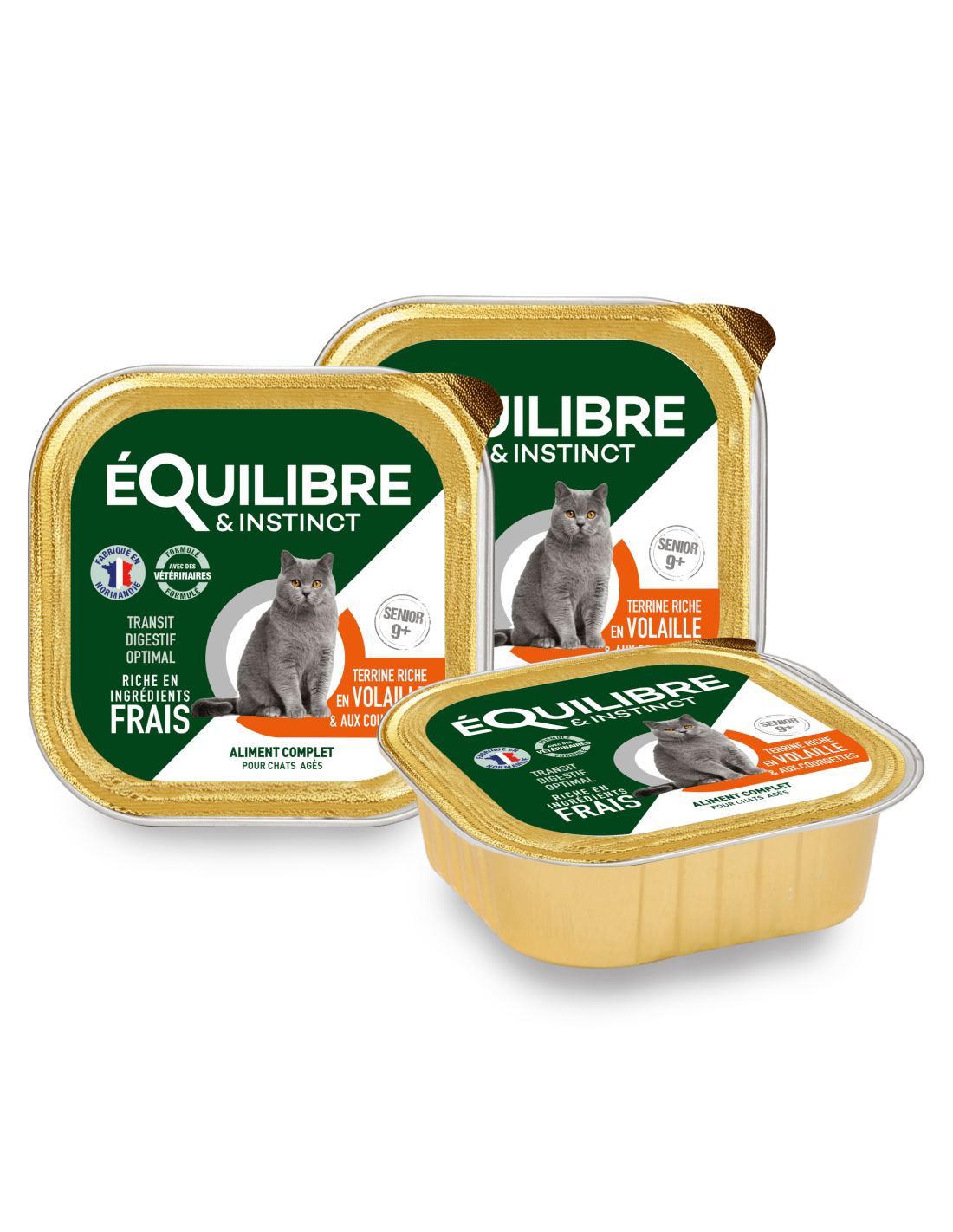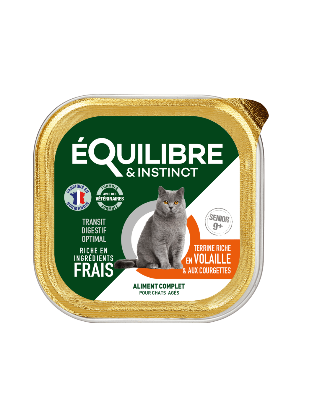 Les pâtées Equilibre & Instinct pour chat âgé riches en volaille et aux courgettes, légumes faibles en calories, sont adaptées à l’activité réduite de votre chat. Cette recette contient de la vitamine E, antioxydant connu qui favorise le maintien des défenses immunitaires et permet de lutter contre le vieillissement cellulaire.