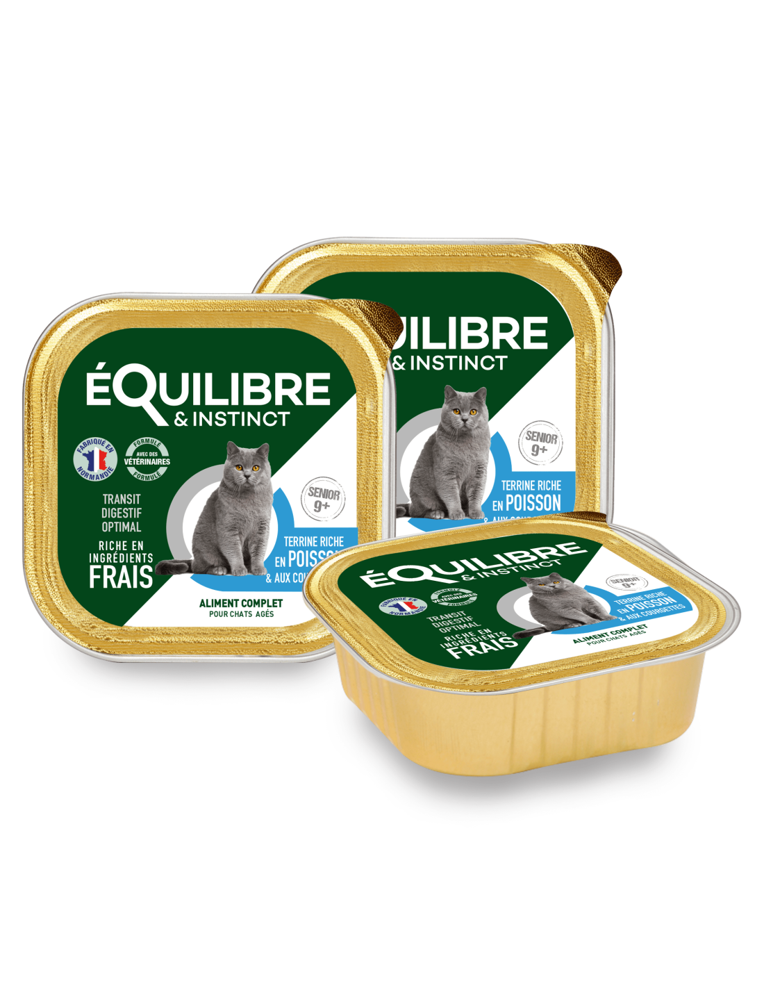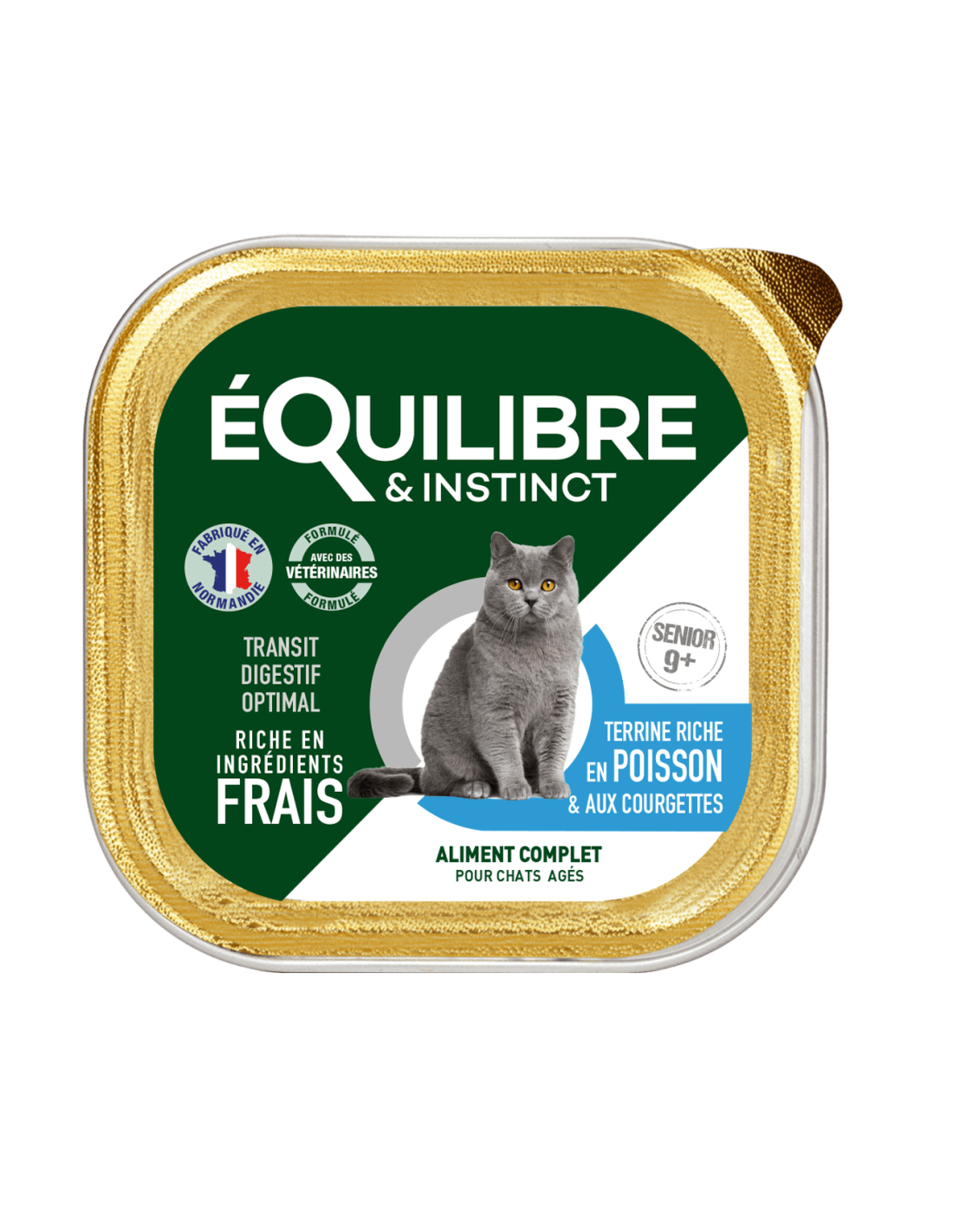 Les pâtées Equilibre & Instinct pour chat âgé riches en poissons et aux courgettes, ingrédients connus pour leur faible teneur en matières grasses, les pâtées pour chat âgé ont un apport énergétique adapté à l’activité de votre chat âgé. Cette recette contient également de la taurine, acide aminé qui aide au maintien de la vision.