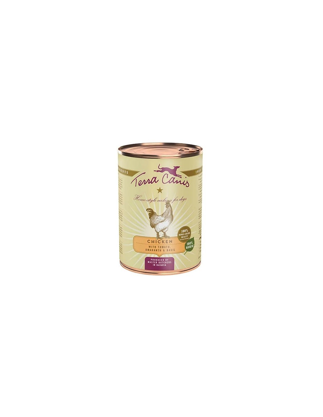 Composition: Cœur de poulet (24 %), tomate (17 %), gésier de poulet (16 %), foie de poulet (11 %), poire, amarante (5 %), viande musculaire de poulet (4 %), millet, betterave*, branches de céleri, farine de noix de coco, huile de colza, coquille d´huître*, levure de bière*, basilic* (0,4 %), ciboulette*, argile*, sel des Andes, cynorhodon*, algue marine*, substances minérales *séché