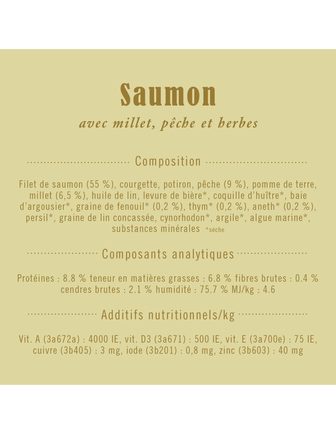 Ratio : Viande : légumes/fruits/herbes : amarante + millet : autres ingrédients = 55 % : 33 % : 5 + 5 % : 2 %