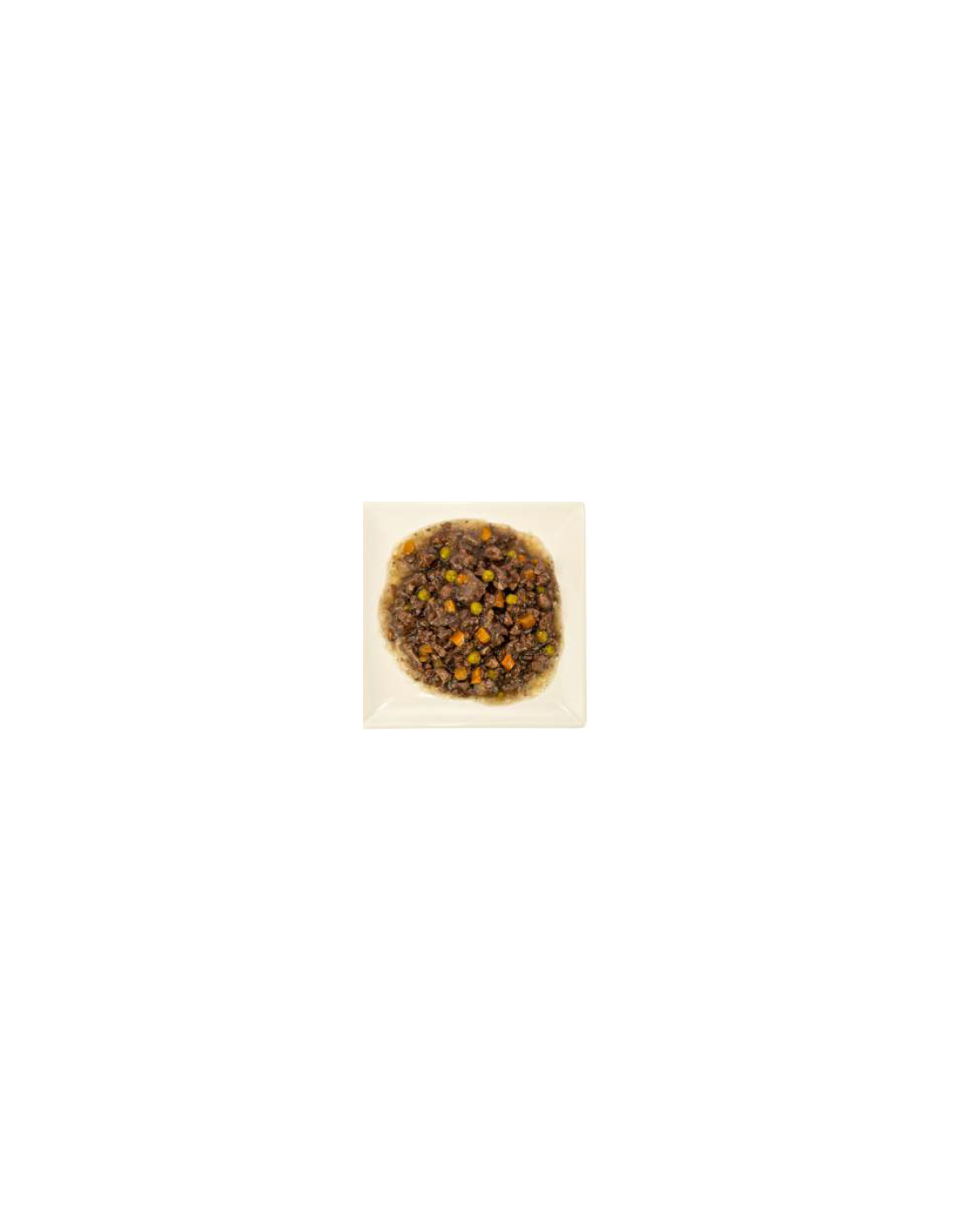 COMPOSITION : 65 % viande de bœuf, 25 % bouillon, 4 % carottes, 4 % pois, mélange d'herbes, huile de saumon, vitamines et minéraux.