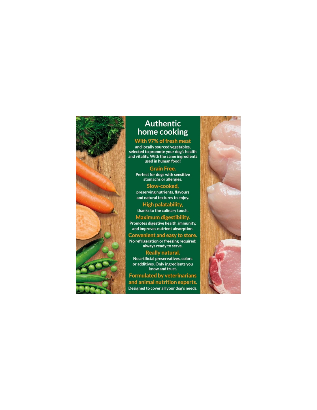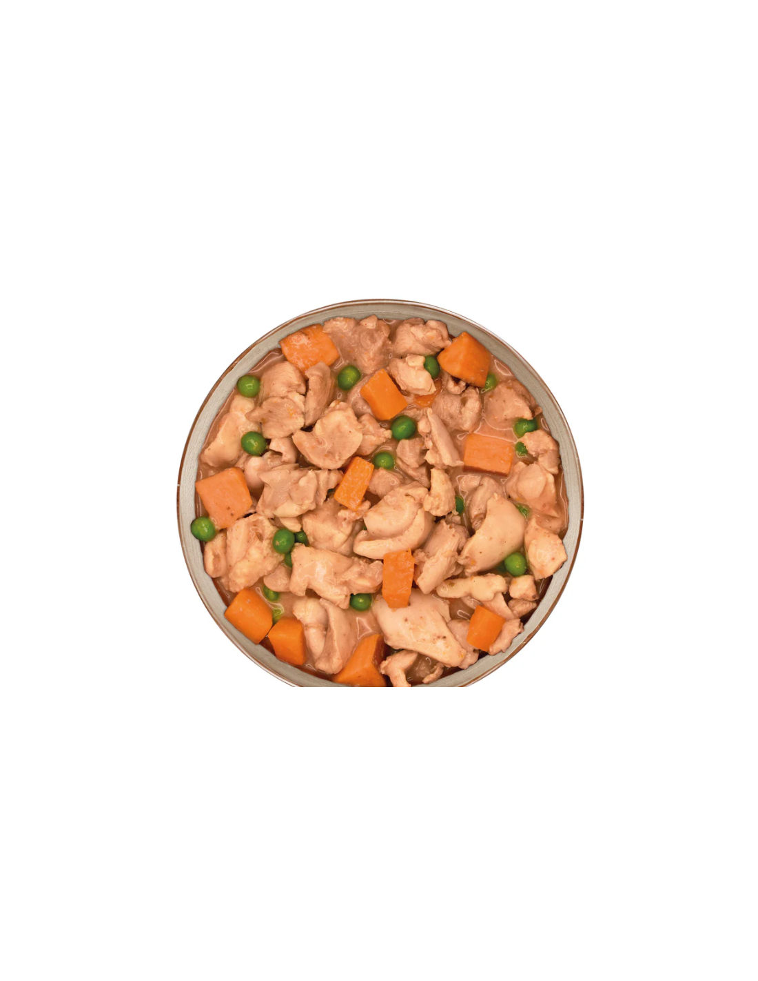 Préparé avec 97 % de viande fraîche de poulet, accompagnée de patate douce, petits pois, carottes et épices naturelles. Des ingrédients de qualité, identiques à ceux utilisés dans l’alimentation humaine, sélectionnés pour soutenir la vitalité et la santé de votre compagnon.