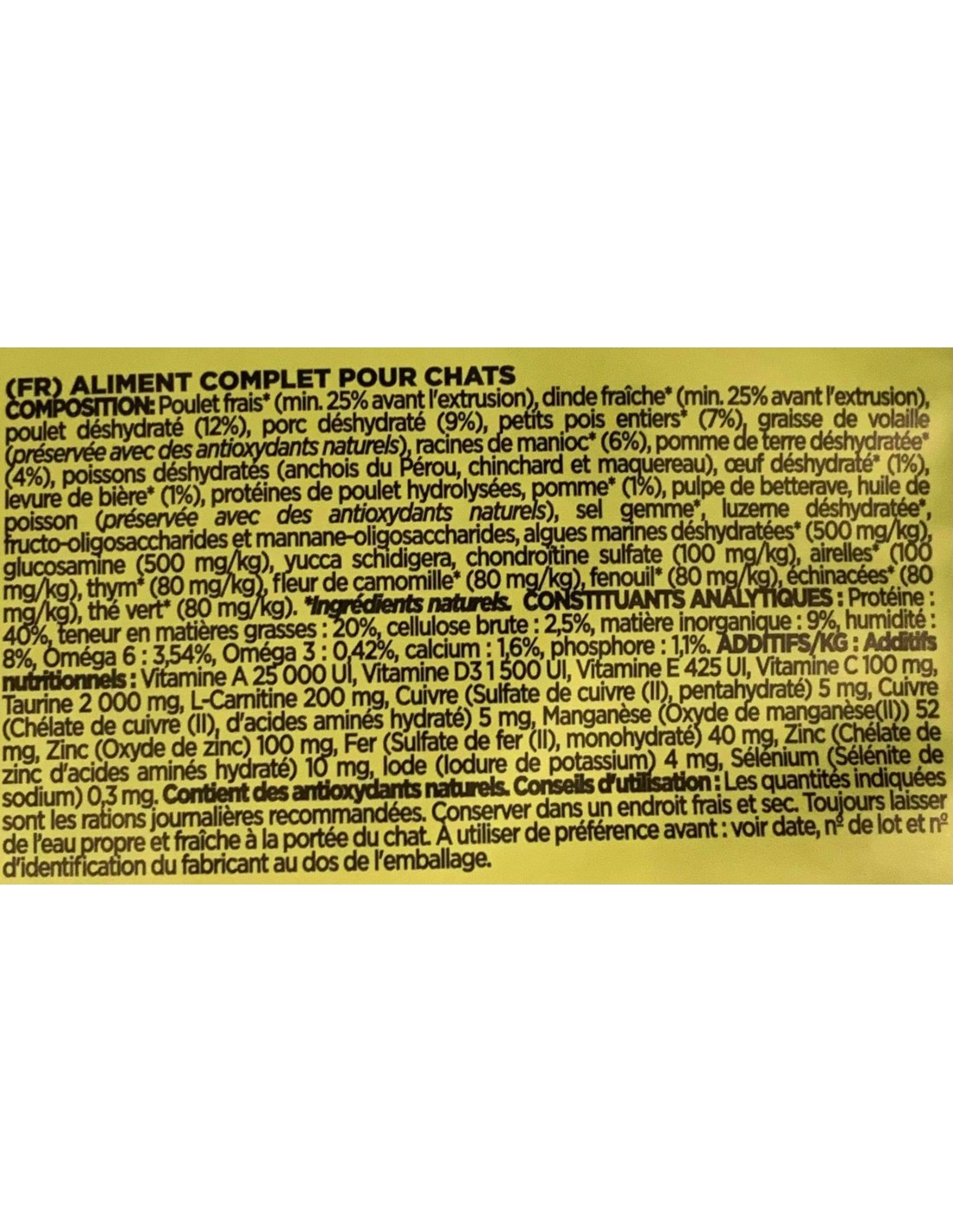 COMPOSITION : Viande fraîche de poulet et de dinde* (min. 50% avant l'extrusion), viande déshydratée (21%), petits pois entiers*, graisse de volaille (préservée avec des antioxydants naturels), racines de manioc*, pomme de terre déshydratée*, poissons déshydratés (anchois du Pérou, chinchard et maquereau), œuf déshydraté*, levure de bière*, protéines de poulet hydrolysées, pomme fraîche* (1%), pulpe de betterave, huile de poisson (préservée avec des antioxydants naturels), sel gemme*, luzerne déshydratée*, fructo-oligosaccharides et mannane-oligosaccharides, algues marines déshydratées*, glucosamine, chondroïtine, yucca schidigera, airelles*, thym*, fleur de camomille*, fenouil*, échinacées*, thé vert*.*Ingrédients naturels
