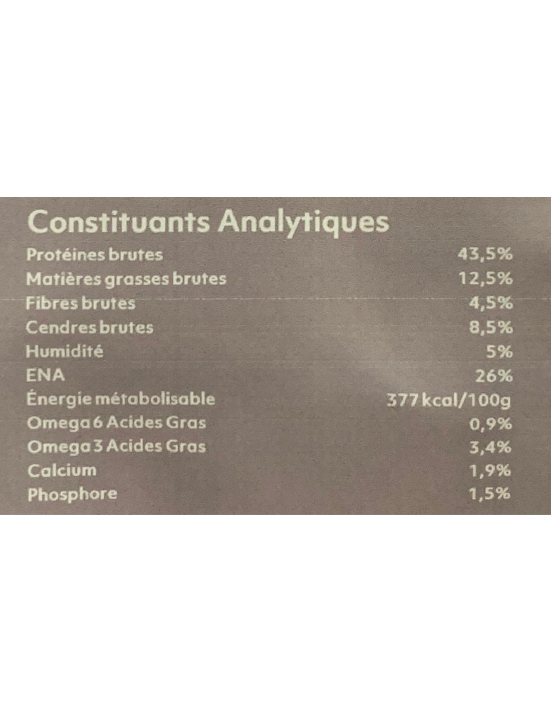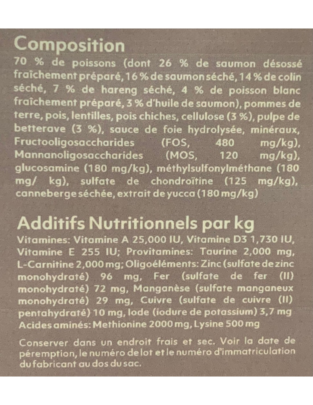 Composition: 70% de poisson (dont 26% de saumon désossé fraîchement préparé, 16% de saumon séché, 14% de colin séché, 7% de hareng séché, 4% de poisson blanc fraîchement préparé, 3% d’huile de saumon), pomme de terre, pois, lentilles, pois chiches, cellulose 3%, pulpe de betterave 3%, sauce de fois hydrolysé, minéraux, FOS (480 mg/kg), MOS (120 mg/kg), glucosamine (180mg/kg), sulfate de chondroïtine (125 mg/kg), canneberge séchée, extrait de yucca