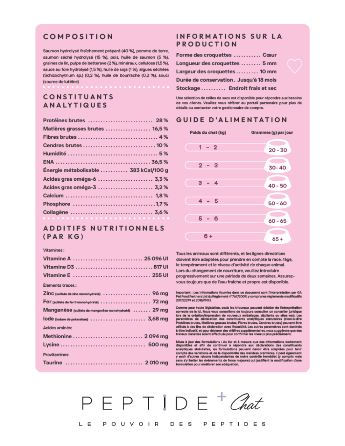Vitamines A, D3, E, Zinc, Fer, Manganèse, Iode, Methionine, Lysine, Taurine.