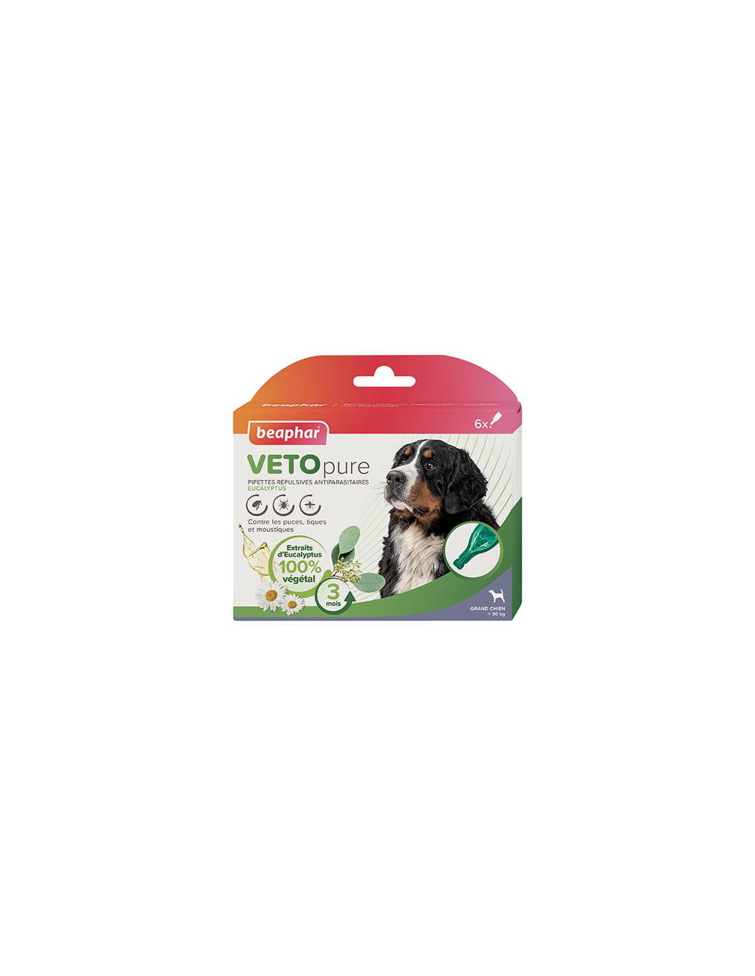 Beaphar a développé la gamme VETOpure, efficace contre les puces, les tiques et les moustiques. Conçues spécialement pour les chiens, les pipettes VETOpure repoussent les parasites externes, grâce à l'huile d'Eucalyptus et aux extraits de Chrysanthemum cinerariaefolium (fleurs de Pyrèthre de Dalmatie). Ces arbre et plante sont reconnus pour leurs vertus répulsives contre les insectes. Si vous devez faire face à une infestation massive, il est recommandé de traiter aussi l’environnement de l’animal et l’habitat avec un insecticide de la gamme VETOpure de Beaphar, comme le spray, le pulvérisateur et les diffuseurs automatiques insecticides habitation.