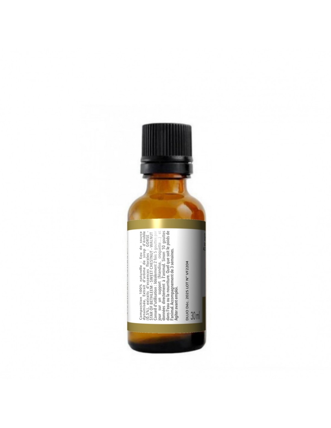 Composition 100% naturelle : Eau de source dynamisée, Extrait d'arôme de sirop d'érable (0,5%), extraits d'essences florales : GORSE - STAR OF BETHLEEM - SWEET CHESTNUT - WALNUT