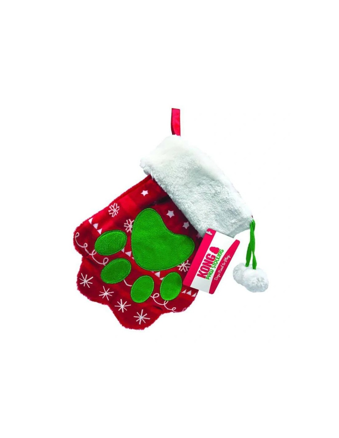Le KONG Holiday stocking paw est une chaussette en tissu peluche rouge,vert et blanc.