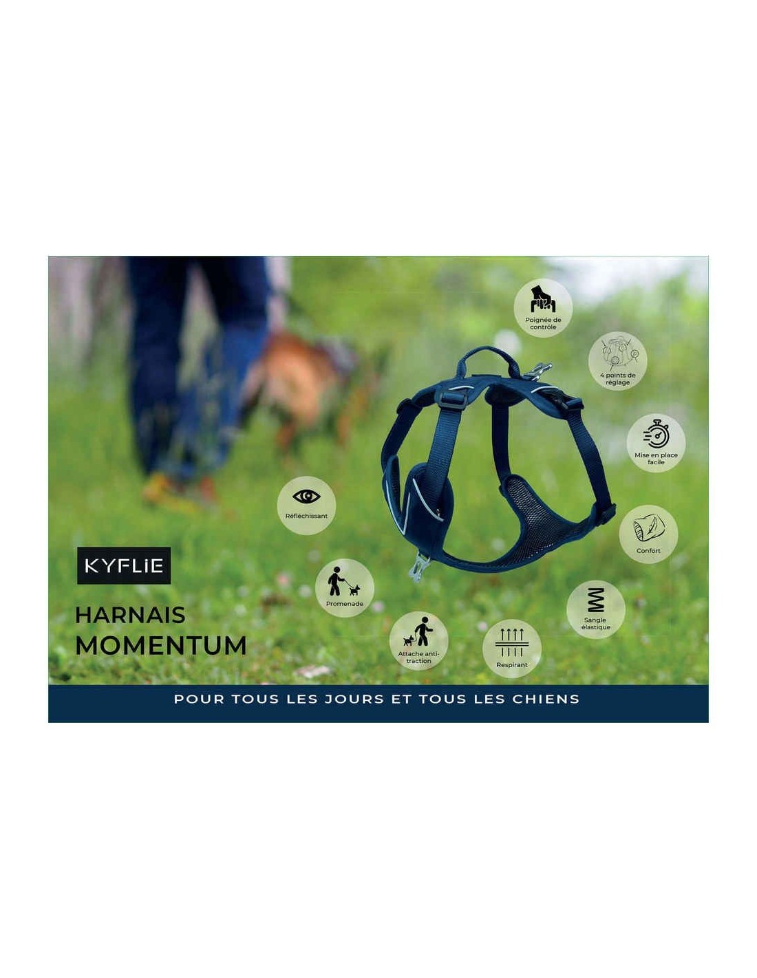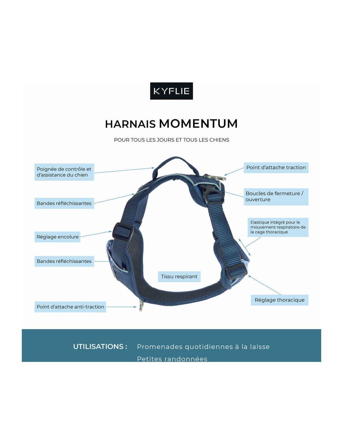 Un harnais multifonction pour la promenade quotidienne: Le harnais MOMENTUM de KYFLIE est un harnais de chien multifonction pour la promenade quotidienne et les activités plein air. Pouvant remplacer le collier, surtout pour les chiens qui tirent en laisse, ce harnais respecte les formes anatomiques du chien au niveau du cou et de la colonne vertébrale sans les endommager.