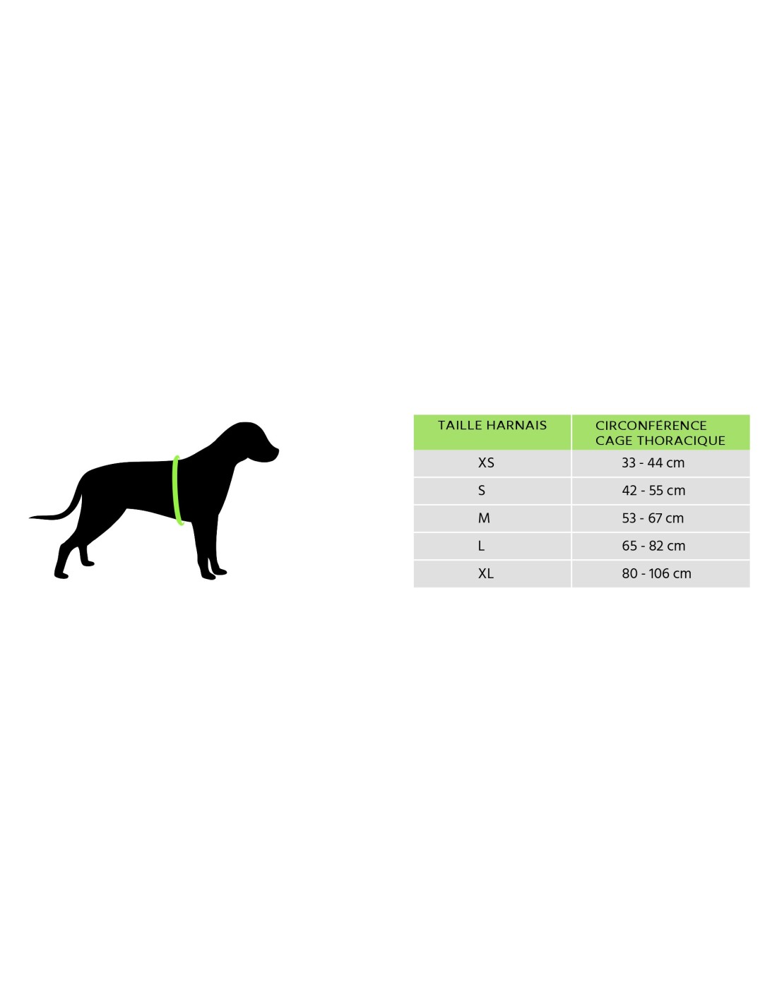 - XL: circonférence de la cage thoracique: 80 à 106cm