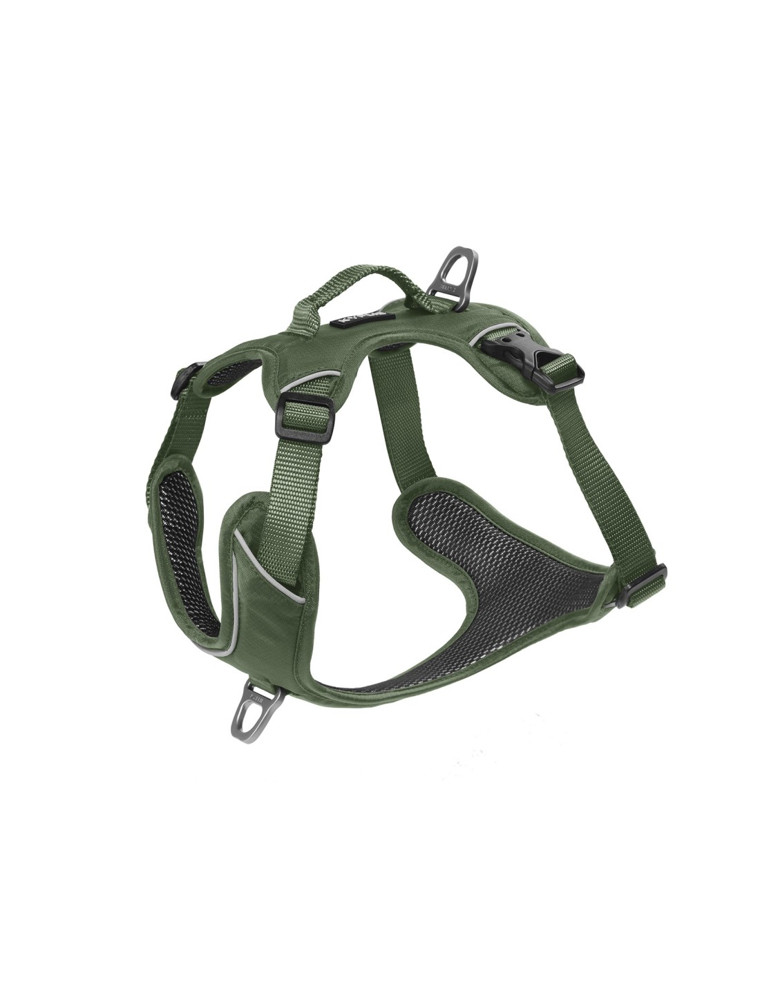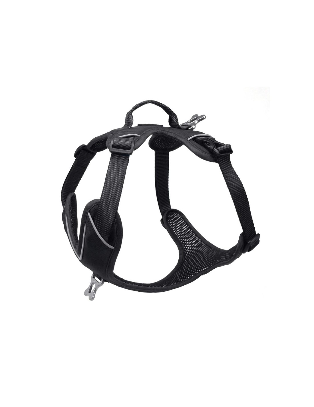 Ergonomique et respirant dans les moindres détails: Un élastique ventral permet d’accompagner l’amplitude de la cage thoracique pour une meilleure respiration. Deux points d’attache métalliques, un anneau traction situé entre les omoplates et un anneau anti-traction sur le poitrail ont une fonction éducative pour l’apprentissage de la marche en laisse. Le tissu mesh intérieur est doux et respirant, sa mousse épaisse améliore le confort du harnais et préserve le chien d’éventuelles blessures. La poignée d’assistance sur le dessus dans le sens longitudinal de la colonne du chien permet une prise en main rapide du harnais pour contrôler et aider le chien en cas d’urgence. La visibilité nocturne augmente grâce aux bandes réfléchissantes.
