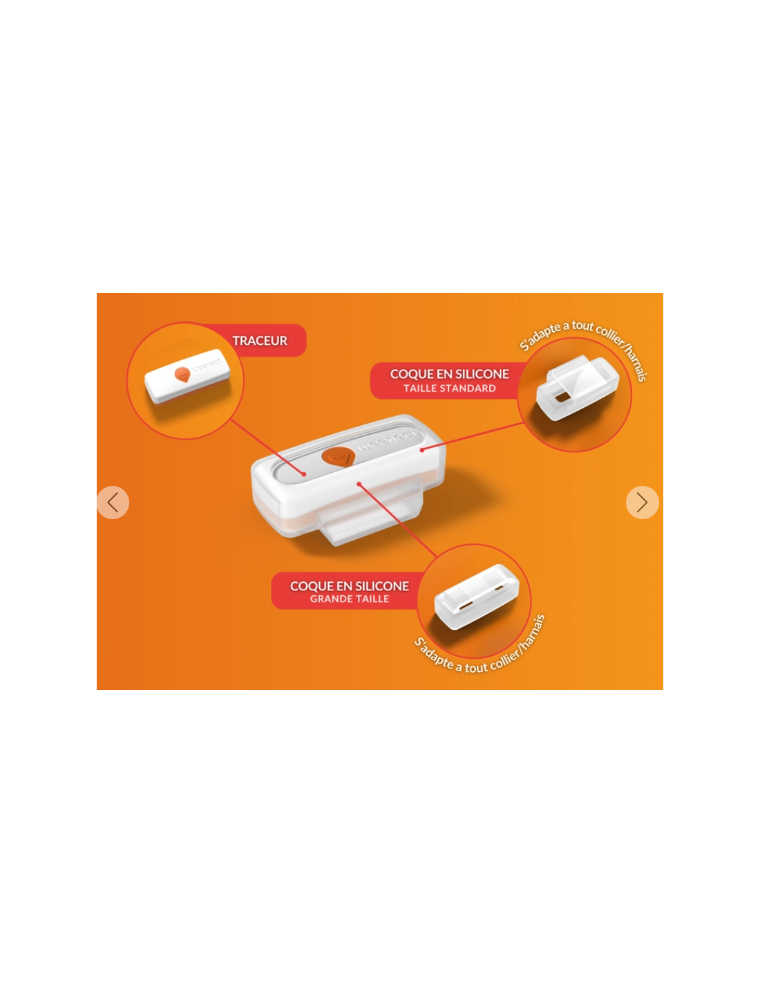• 2 coques en silicone incluses : s’adaptent à tous types de colliers ou harnais.