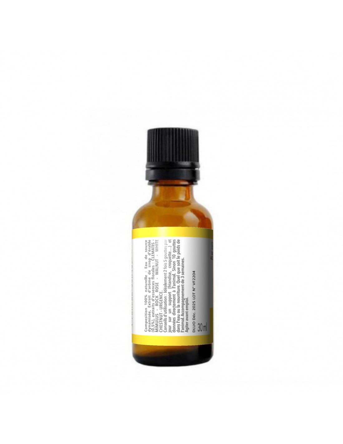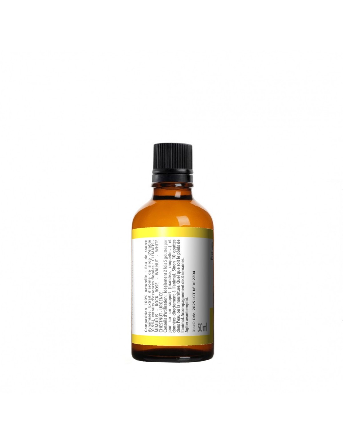 Elixir floral selon la méthode du Docteur Bach. Les Fleurs de Bach sans alcool pour animal stressé, fabriquées en France, rééquilibrent le système émotionel de l'animal stressé.
