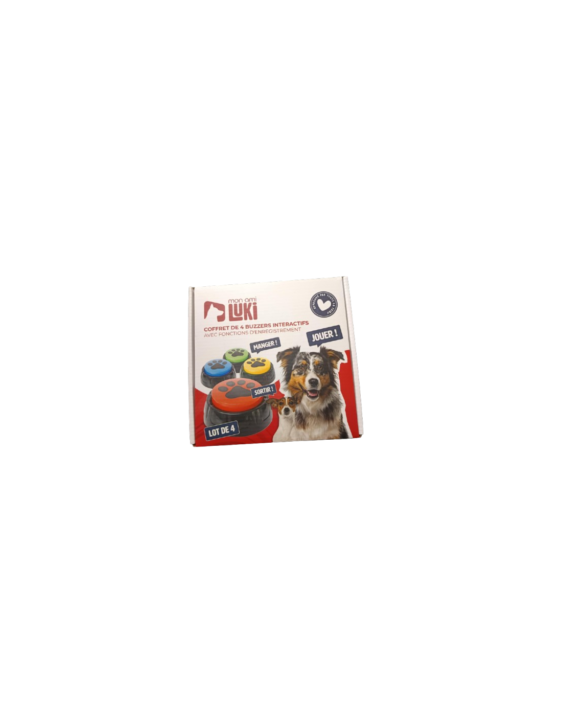 Grâce à sa fonction d’enregistrement vocale, le buzzer interactif "Mon Ami Luki" permet d’enregistrer des mots ou phrases courtes comme “manger”, “boire”, “jouer” ou “sortir”, pour que votre compagnon puisse exprimer ses besoins du quotidien.