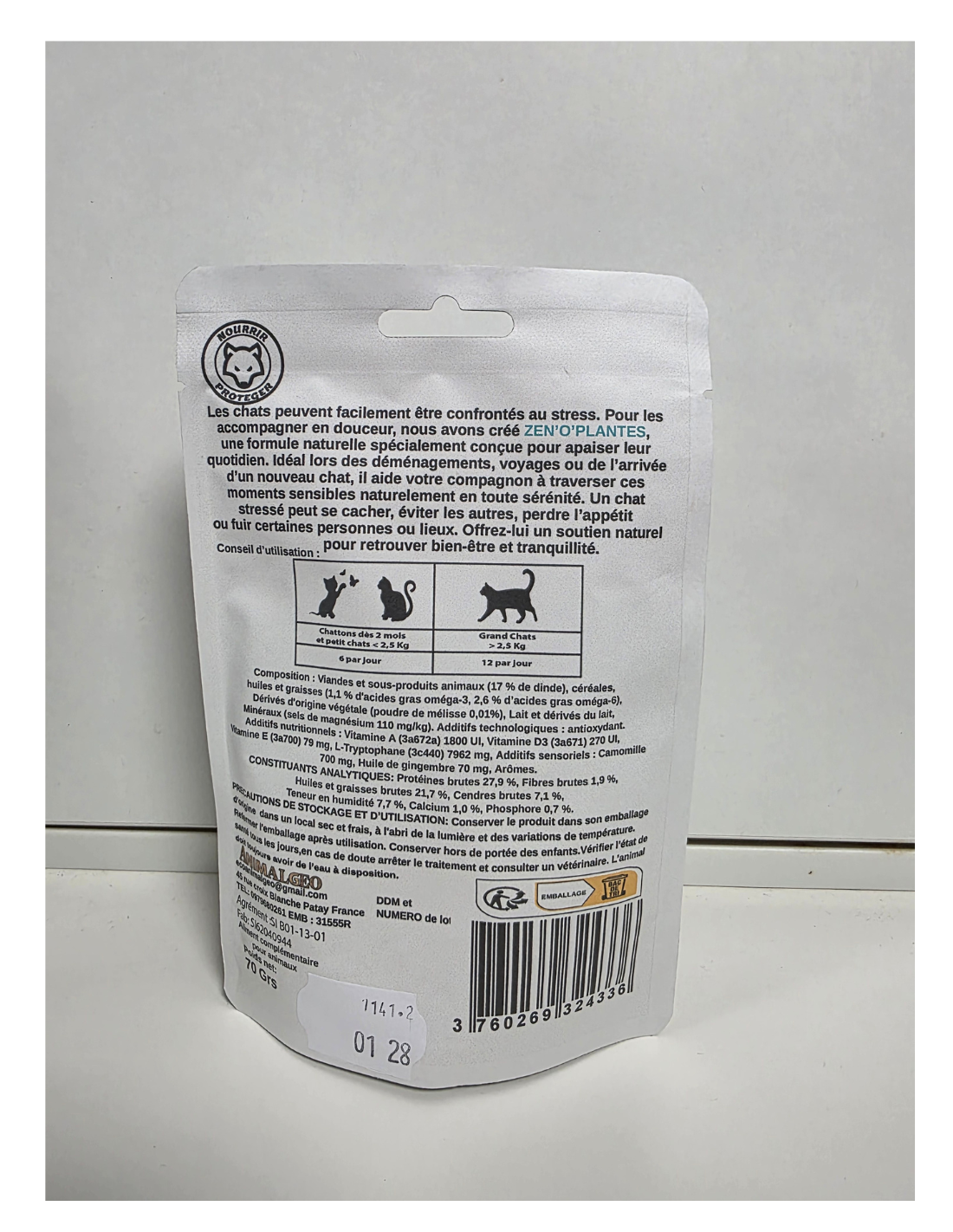 composition: Viandes et sous-produits animaux ( 17% de dinde), céréales, huiles et graisses (1,1% d'acides gras oméga-3, 2,6% d'acides gras oméga-6), dérivés d'origine végétale (poudre de mélisse 0,01%), lait et dérivés du lait, Minéraux ( sels de magnésium 110 mg/kg). Additifs technologiques: antioxydant. Additifs nutritionnels : Vitamine A ( 3a672a) 1800 UI, Vitamine D3 ( 3a671) 270 UI, Vitamine E (3a700) 79 mg, L-Tryptophane (3c440) 7962mg, additifs sensoriels : camomille 700 mg, Huile de gingembre 70 mg, Arômes.