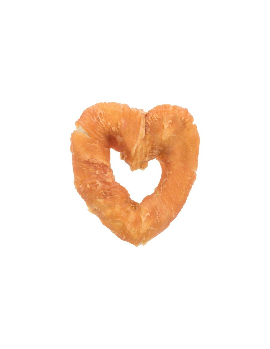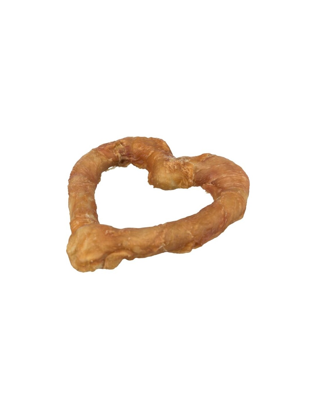 Friandise Denta fun en forme de coeur en cuir brut enveloppé de viande de poulet.