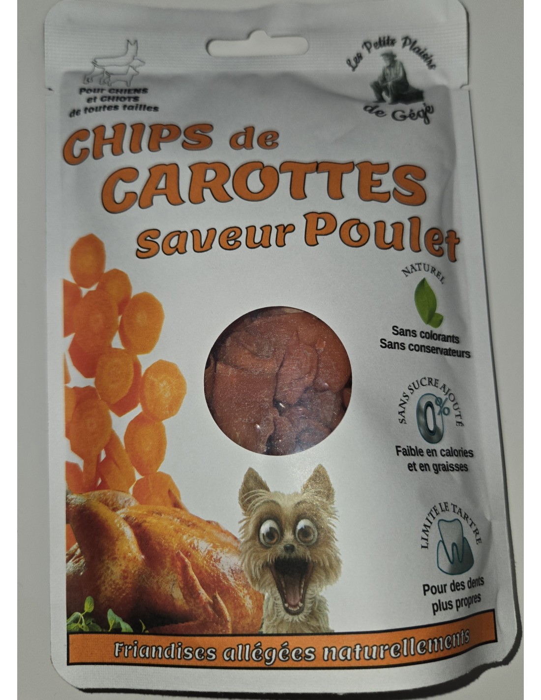Offrez à votre compagnon une friandise saine et gourmande avec nos chips de carottes saveur poulet. Naturellement riches en fibres et faibles en calories, elles sont idéales pour récompenser votre chien sans culpabiliser. Leur texture croustillante participe également à l’entretien des dents.