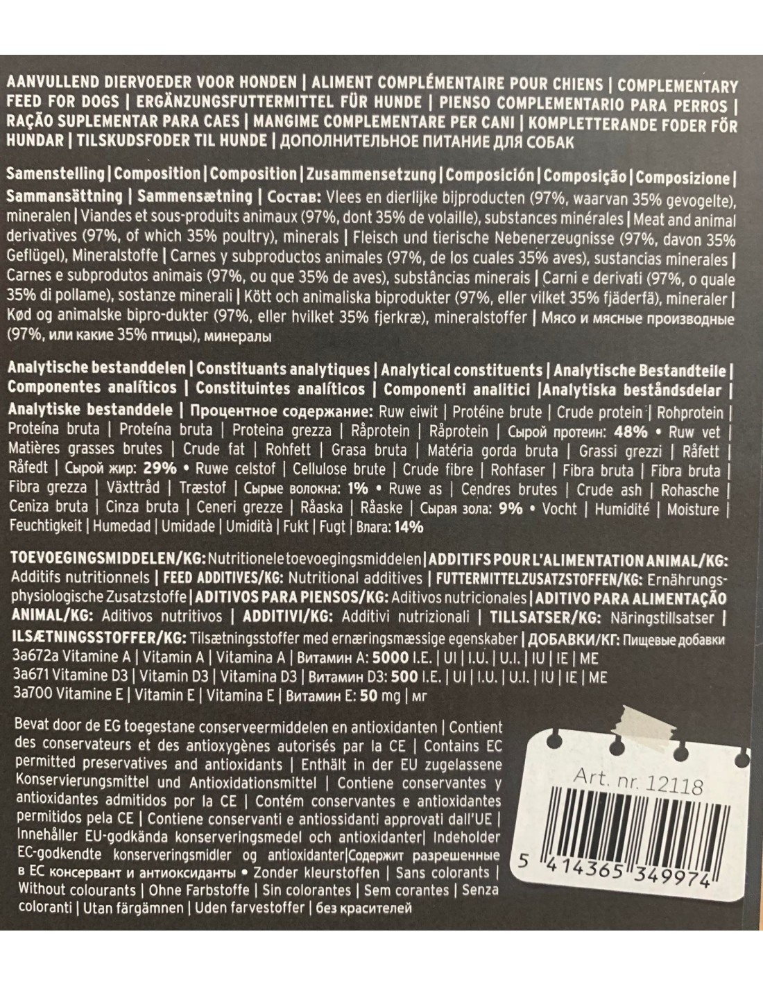Compositions : Viandes et sous-produits animaux (97%, dont 15% volaille), substances minérales