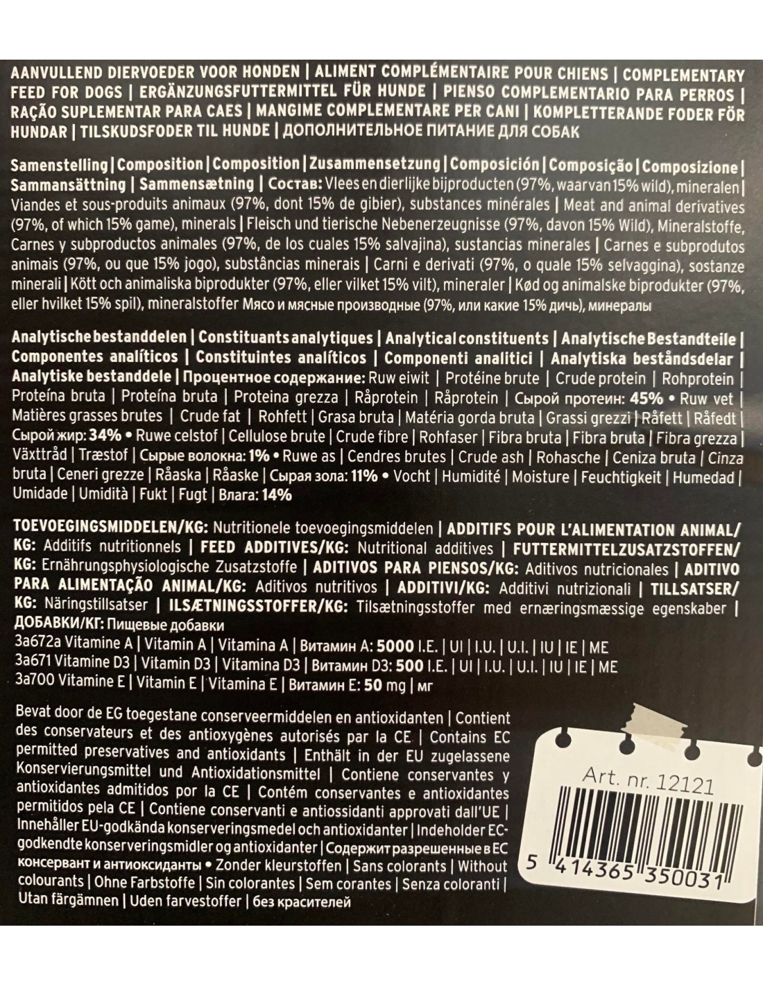 Compositions : Viandes et sous-produits animaux (97%, dont 15% gibiers), substances minérales