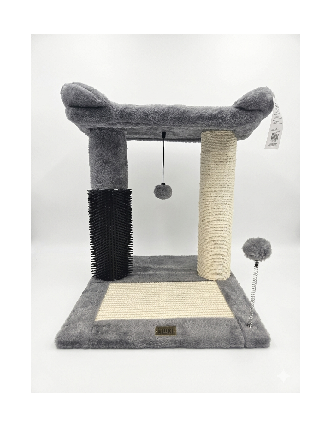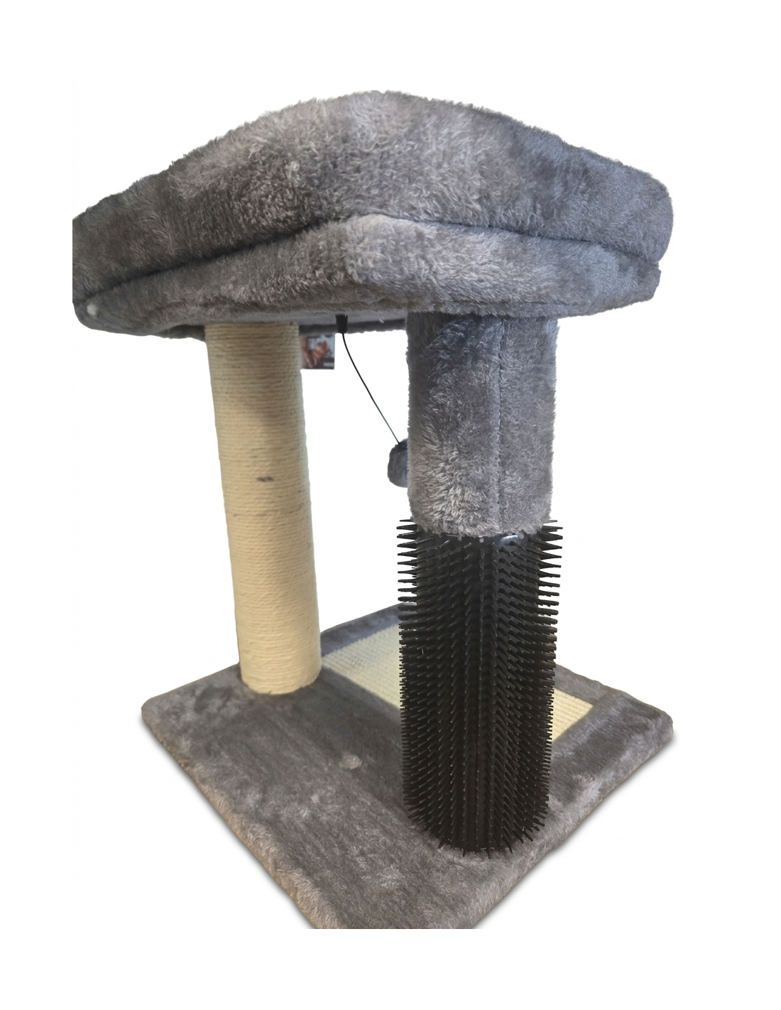 Arbre à chat stable avec un grand plateau reposoir sur 2 larges poteaux de 8cm (dont un griffoir et un grattoir). Le tout sur un plateau avec griffoir horizontal.