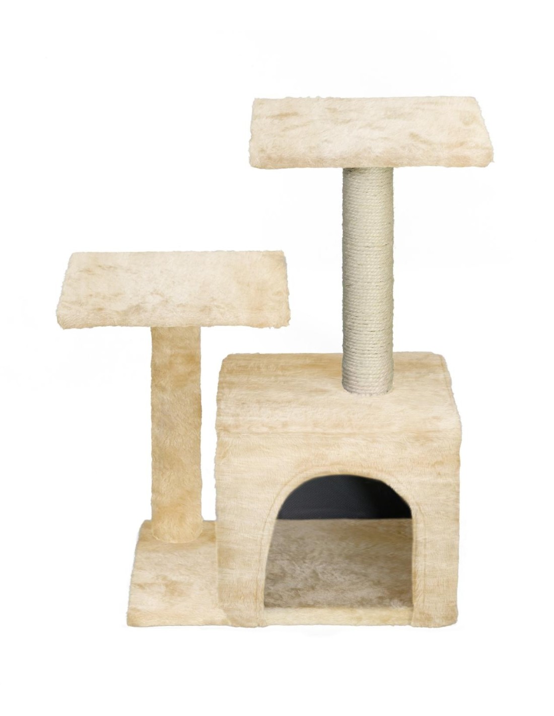 Arbre à chat stable avec deux plateaux reposoirs sur poteaux griffoirs et une niche/cachette.