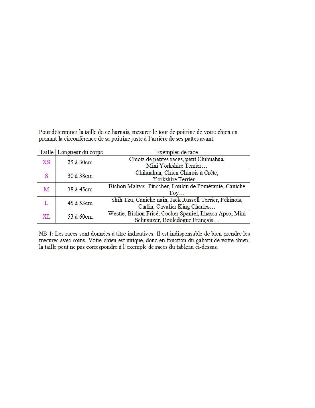 NB 1: Les races sont données à titre indicatives. Il est indispensable de bien prendre les mesures avec soins. Votre chien est unique, donc en fonction du gabarit de votre chien, la taille peut ne pas correspondre à l’exemple de races du tableau ci-dessus.