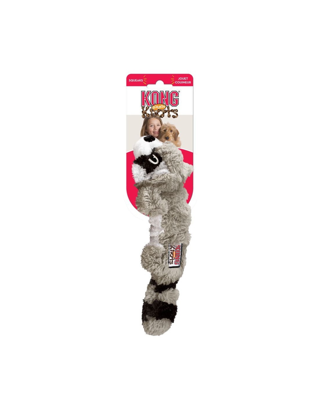 Les KONG Scrunch Knots sont des jouets réalistes qui éveillent sans cesse la curiosité des chiens. Le matériau en peluche se froisse autour de la corde nouée à l’intérieur, tandis que les côtés extensibles impriment un mouvement naturel qui les incite au jeu. Les nœuds satisferont leurs instincts naturels et comme ces jouets ne contiennent pas de rembourrage, ils font moins de salissures