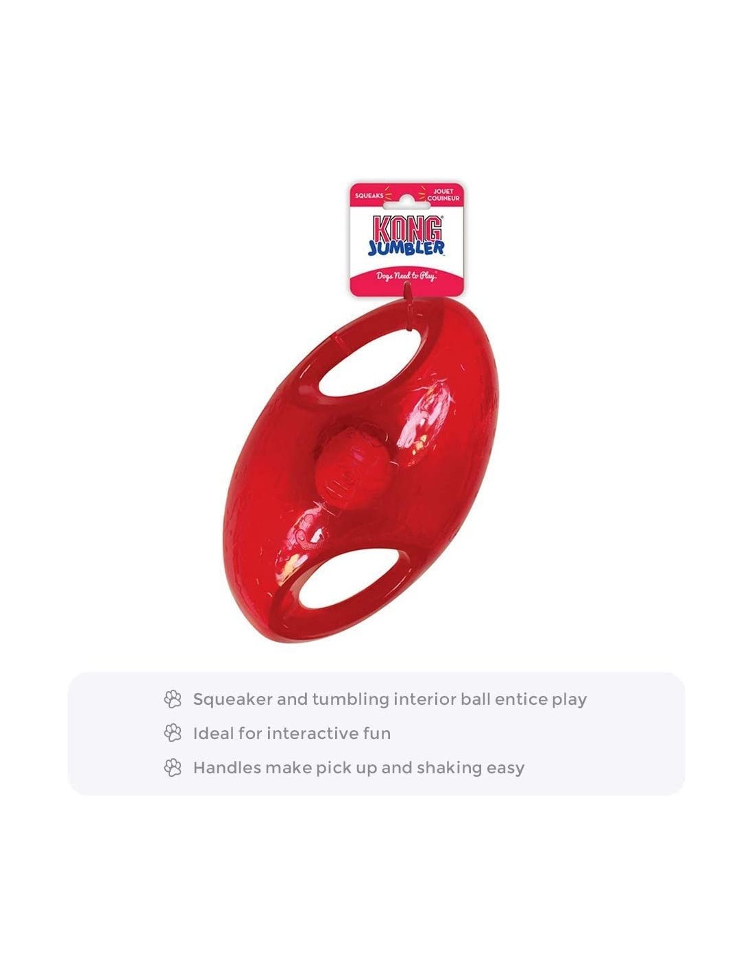 Le KONG® Jumbler est une balle ovale deux en un pour deux fois plus de divertissement ludique et interactif. La balle de tennis à l’intérieur et le couineur puissant incitent au jeu. Les poignets du jouet permettent de le ramasser et de le secouer facilement.