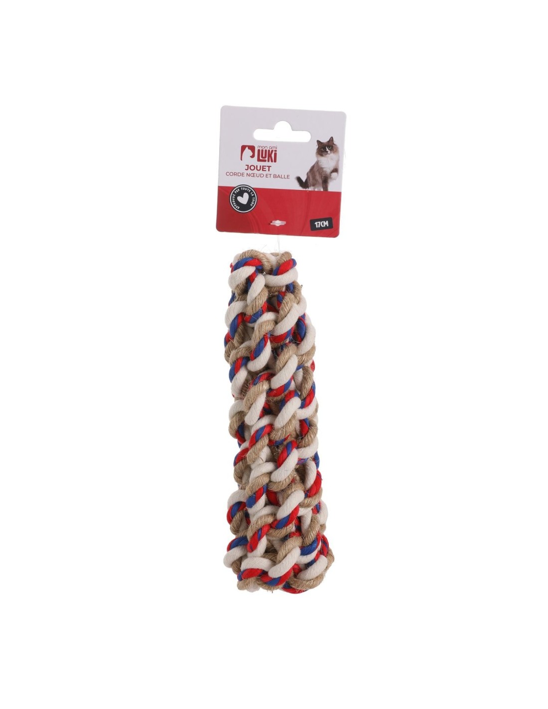 Jouet en corde colorée (naturelle, bleu, rouge et blanc) formant une matraque de 17cm