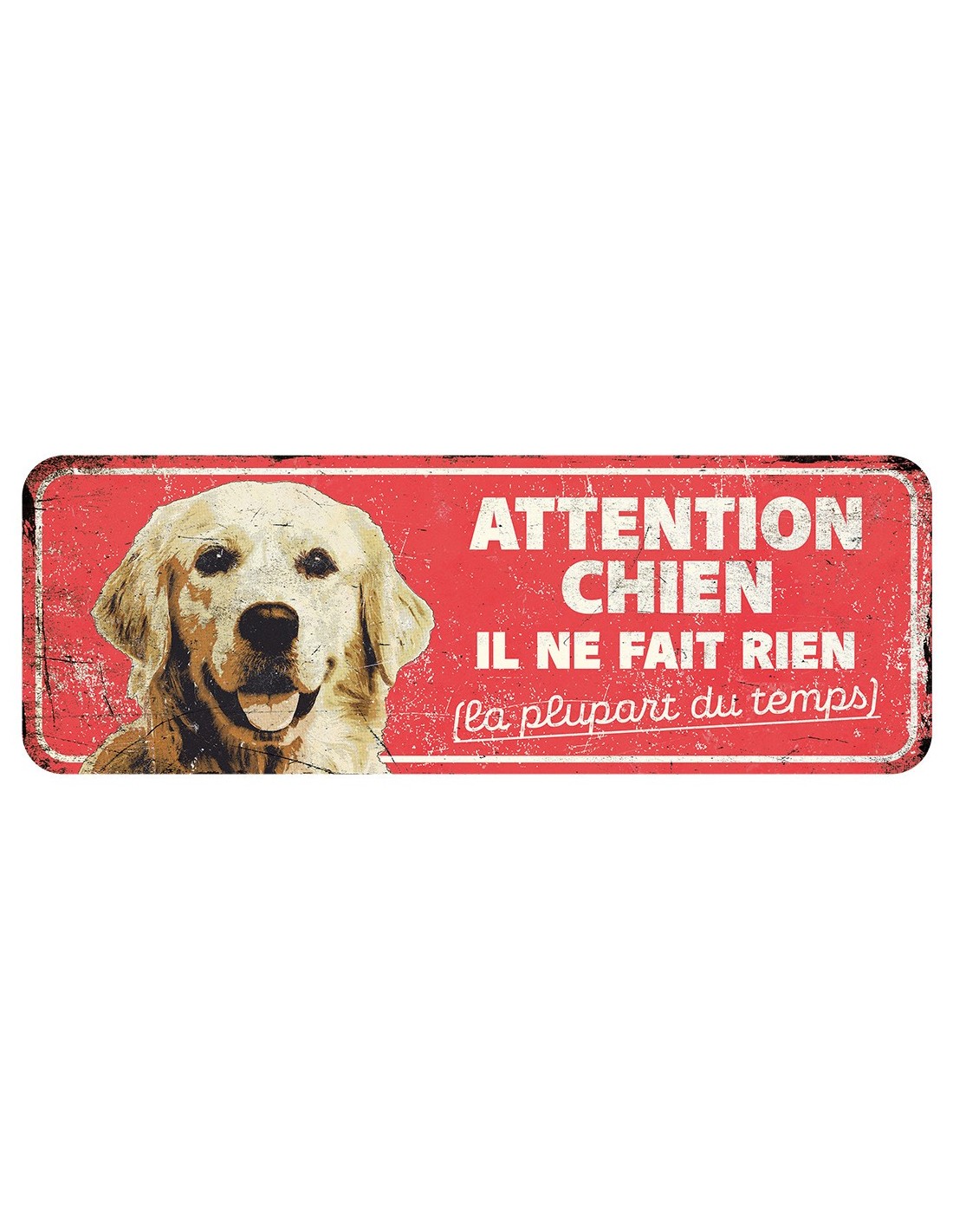 Plaque métal d'avertissement golden retriever humoristique en style délavé.