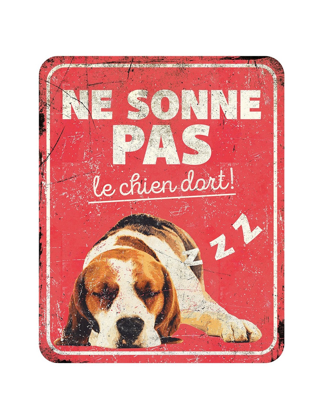 Plaque métal d'avertissement beagle humoristique en style délavé.