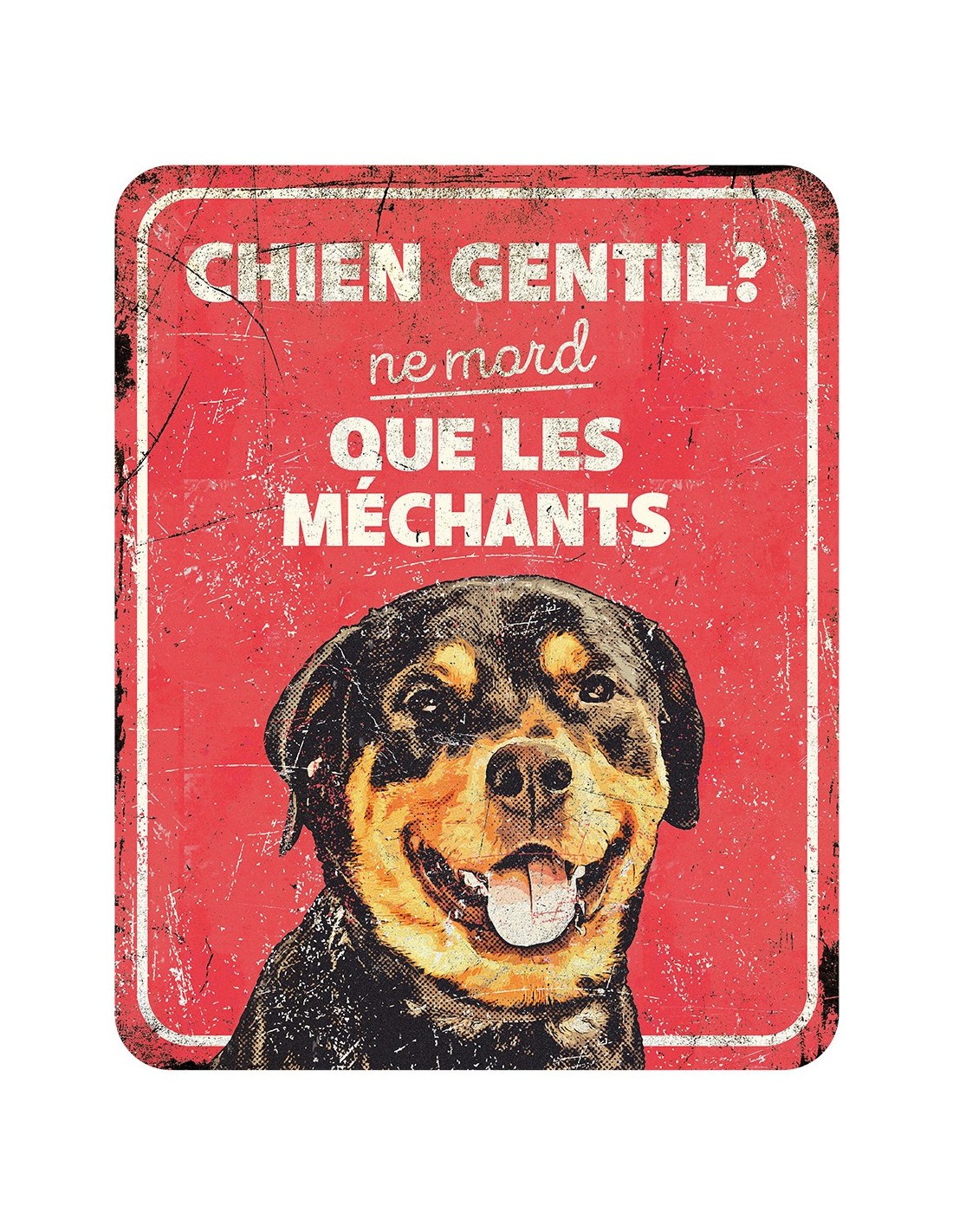 Plaque métal d'avertissement rottweiler humoristique en style délavé.
