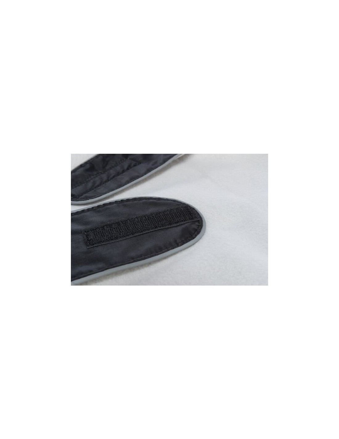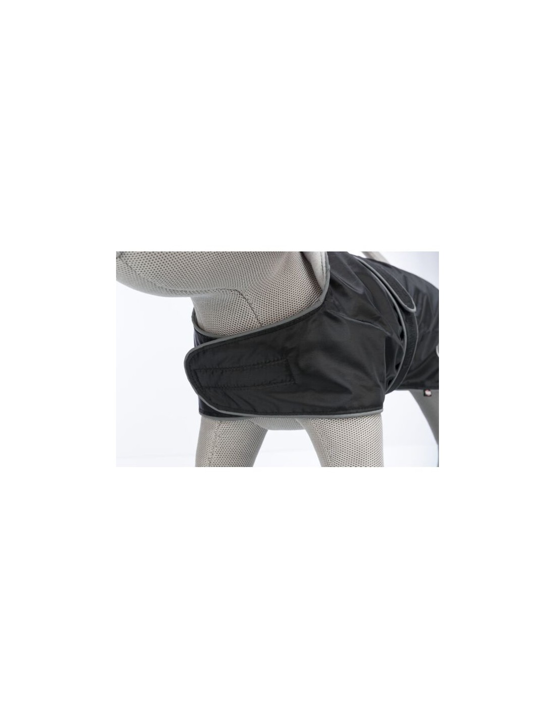 La veste a un rabat de poitrine à velcro pour garder la poitrine du chien à l'abri du vent et un col court pour laisser libre accès a son collier. Les cuissardes assurent un bon ajustement et la veste reste en place.