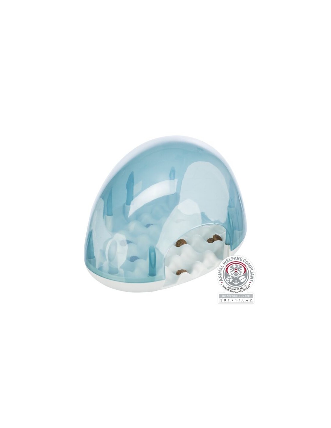 Le jouet est en plastique et anti-dérapant grâce à l'anneau en caoutchouc. Destiné pour les chats âgés de plus de 3 mois, elle peut aussi s'utiliser pour l'alimentation quotidienne avec la nourriture sèche. Une base ondulée et dôme avec 3 trous.
