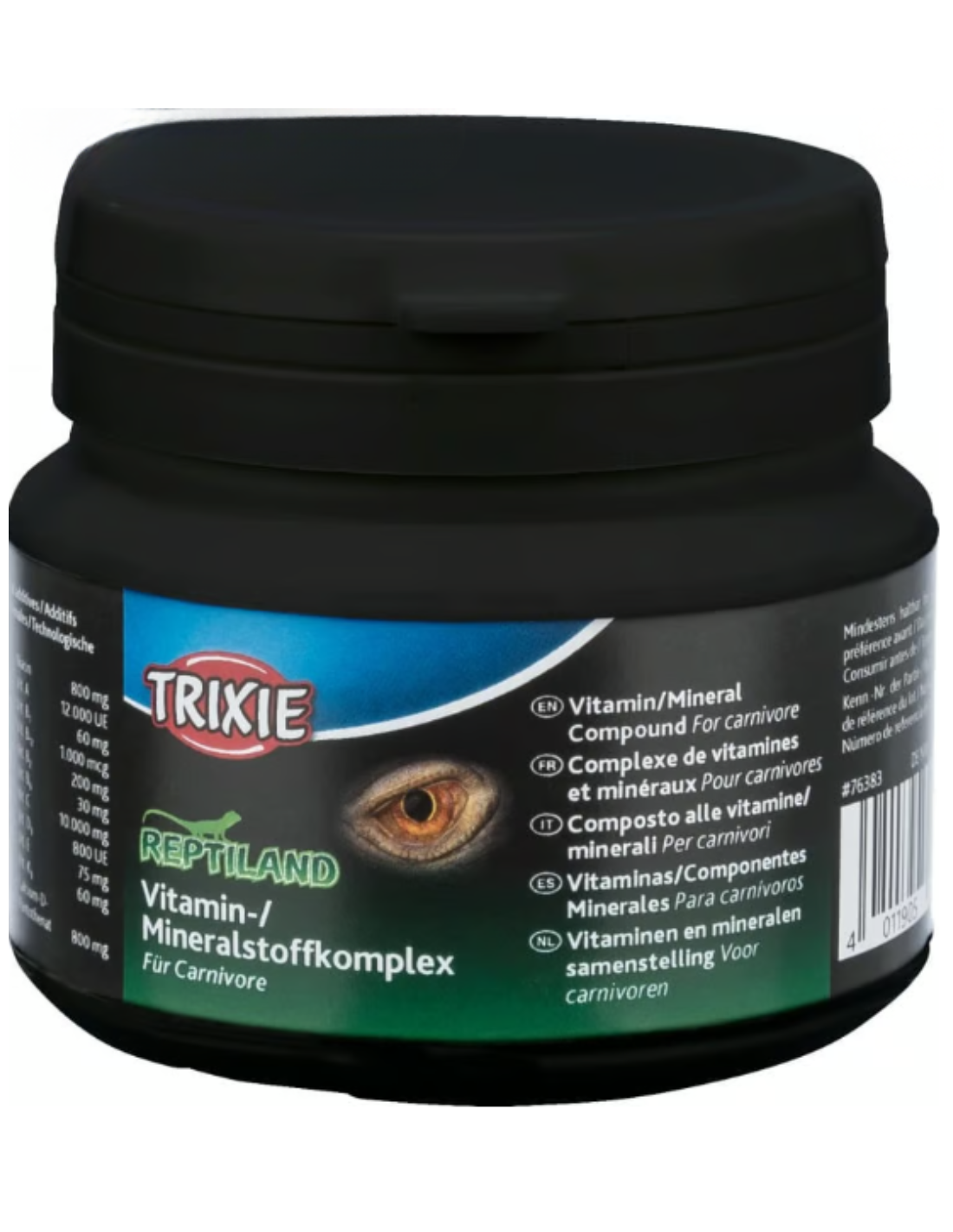 Complexe de vitamines et minéraux Trixie pour reptiles carnivores et amphibiens, enrichi en micro-calcium et vitamine D3. Complément nutritionnel conçu pour soutenir l’équilibre minéral et la vitalité.