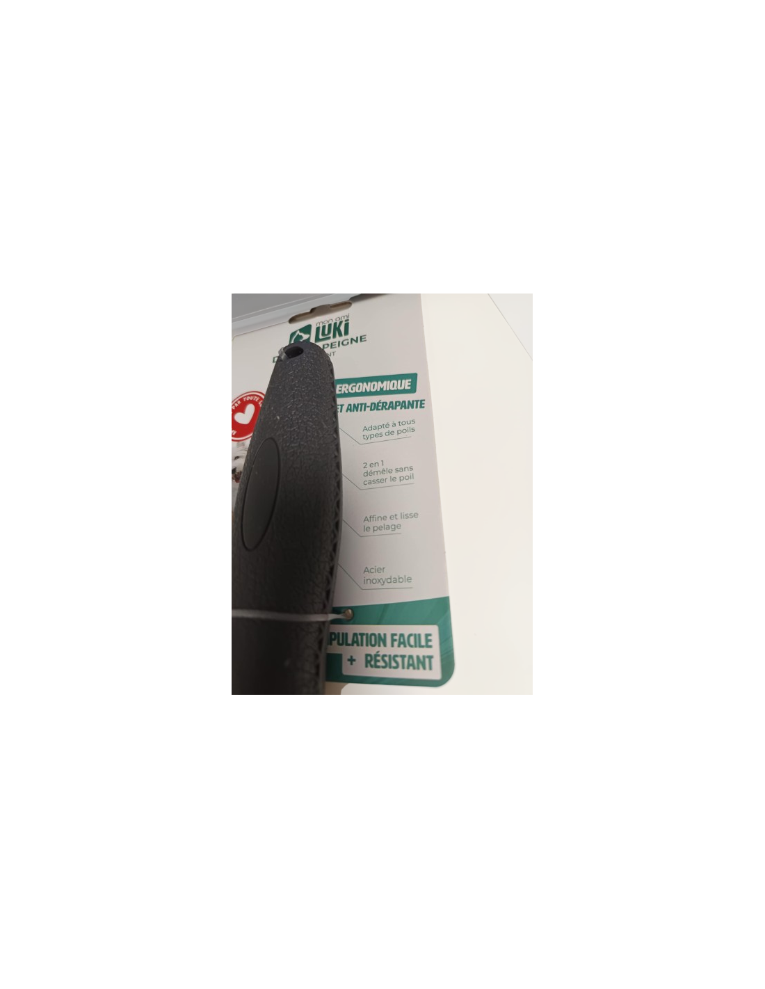 Conçu pour s'adapter à tous types de poils, il dispose d'une face avec des picots espacés pour un premier démêlage en douceur et d'une autre face avec des picots rapprochés pour affiner et lisser le pelage. Grâce à sa conception ergonomique et son manche antidérapant, il assure une prise en main confortable et sécurisée.